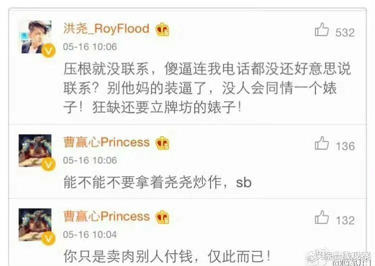 但没甜蜜多久,洪尧就被曝出和另一个网红李蒽熙的绯闻,三人也是在网络上开启了一段时间的“骂战”。以至于洪尧和曹赢心分手后,还发博说曹赢心的大小姐脾气自己受不了。