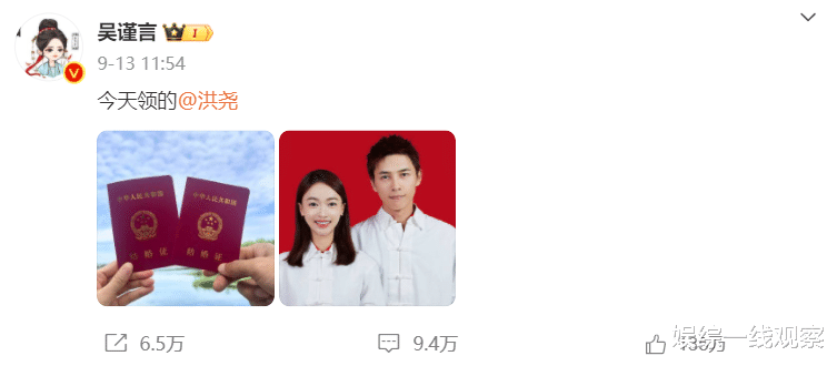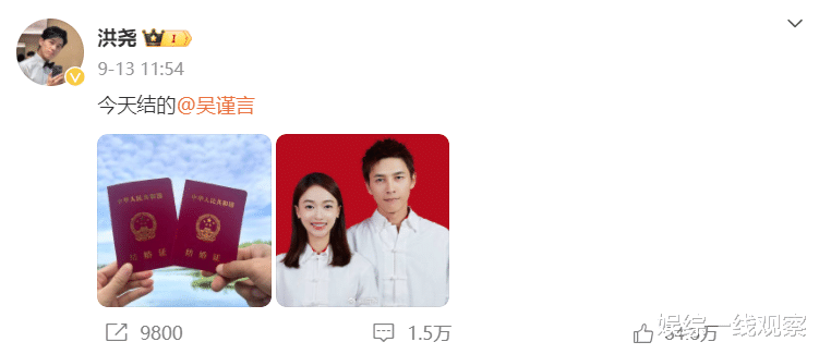 9月13日,吴谨言、洪尧同时在社交平台发文官宣,并晒出了两人手持结婚证和红底结婚照,并且配文:“今天结的,今天领的”。