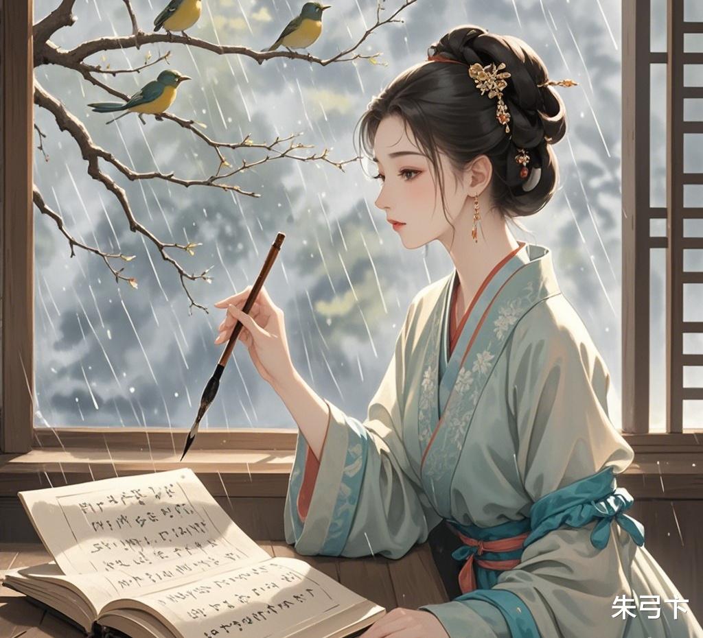 《红楼梦》中描写秋夜雨的情景:秋霖霢霢,阴晴不定。那天渐渐的黄昏,且阴的沉黑,兼着那雨滴竹梢,更觉凄凉。林黛玉孤独、哀愁之感更甚。她拿起一本《乐府杂稿》,心有所感,于是摹拟唐代张若虚的《春江花月夜》的格调写成《代别离》一首,名之为《秋窗风雨夕》(此处《春江花月夜》呼应“一江水冷月光”)。