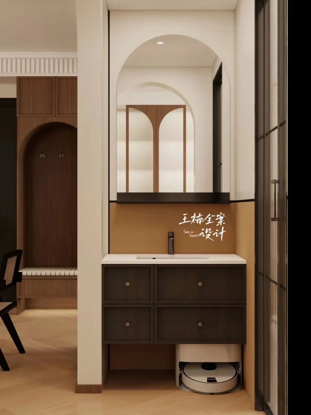 设计要点/ 想装美拉德复古风不踩雷,抓这两点就够:1:用“柔元素”破老气:别全用直线条,加弧形门洞、弧形柜体,柔化复古的厚重感;2:材质“透气不闷”:暖木色为主的同时,加藤编、玻璃等透气材质,避免空间太沉闷”。