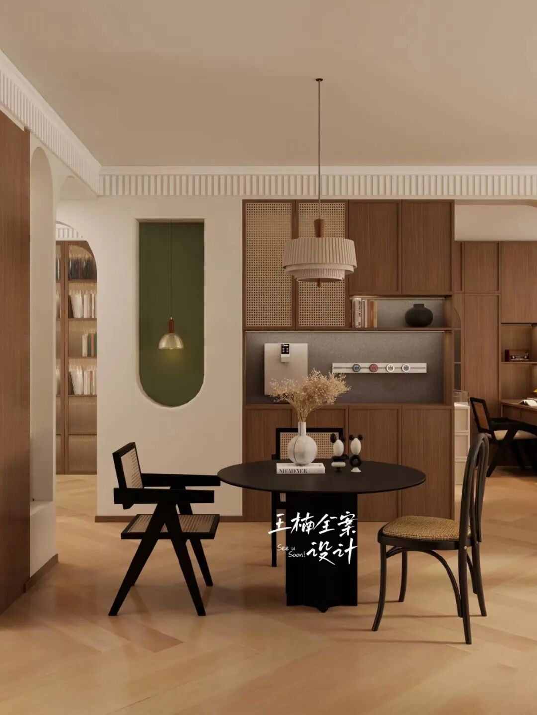 餐厅:复古餐桌的烟火仪式🥂圆形餐桌刚好装下一家人的聚餐黑棕藤编椅和暖木色呼应坐感舒服又显质感旁边的嵌入式水吧太实用接水、放茶具不用跑厨房藤编门板还和客厅风格连得自然弧形造型墙+氛围灯一衬吃饭的瞬间像在复古小馆里,烟火气里全是仪式感