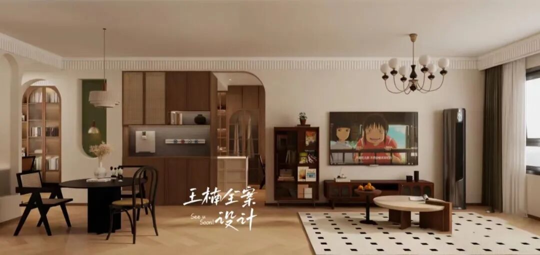 客厅:暖棕里的复古松弛感🛋️暖木色+藤编元素直接把美拉德氛围拉满弧形门洞柔化了空间线条不会像直线那样生硬整面木饰面收纳柜藏了杂物中间藤编面板透气又显质感复古吊灯的奶白灯罩+黑棕灯架刚好踩中“复古不老气”的点配上软糯的焦糖色沙发、黑白棋盘格地毯瘫在这追剧,连空气都裹着暖乎乎的松弛感