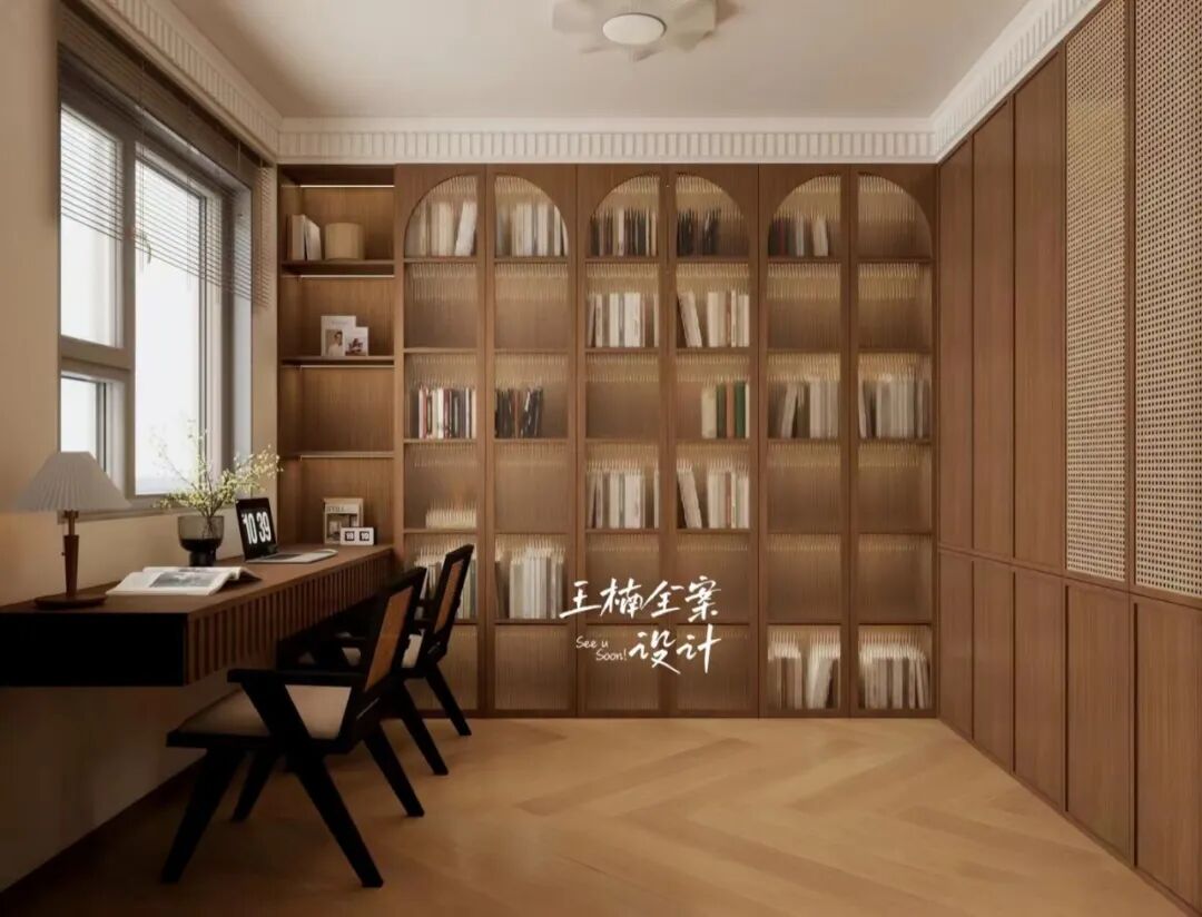 书房:美拉德的阅读慢时光📖整面弧形书墙是书房的灵魂既能藏满书籍弧形设计还呼应了全屋的柔线条长书桌做了双人位不管是自己办公还是陪娃阅读都够宽敞暖木色+内嵌灯光哪怕在这待一下午,也只会觉得安静舒服这哪里是书房,明明是能慢下来的松弛角落
