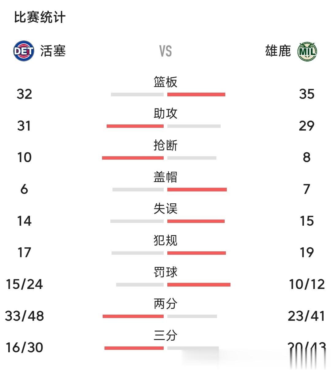 雄鹿本场三分球43中20,但命中率低于活塞的30中16。