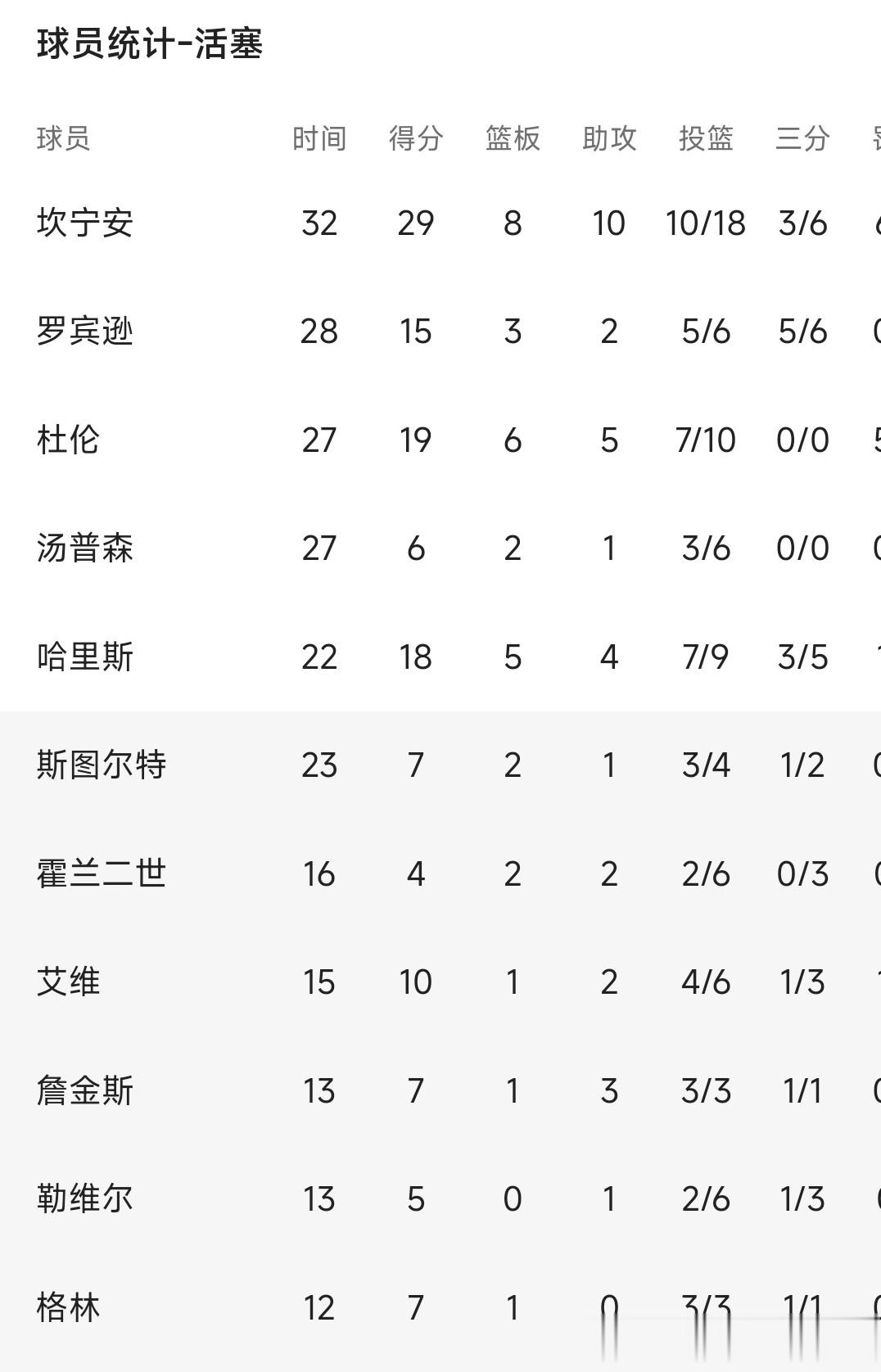 球员方面,活塞的坎宁安状态爆棚,18投10中拿到准三双的29分8篮板10助攻,杜伦19分6篮板5助攻,罗宾逊15分,哈里斯18分。