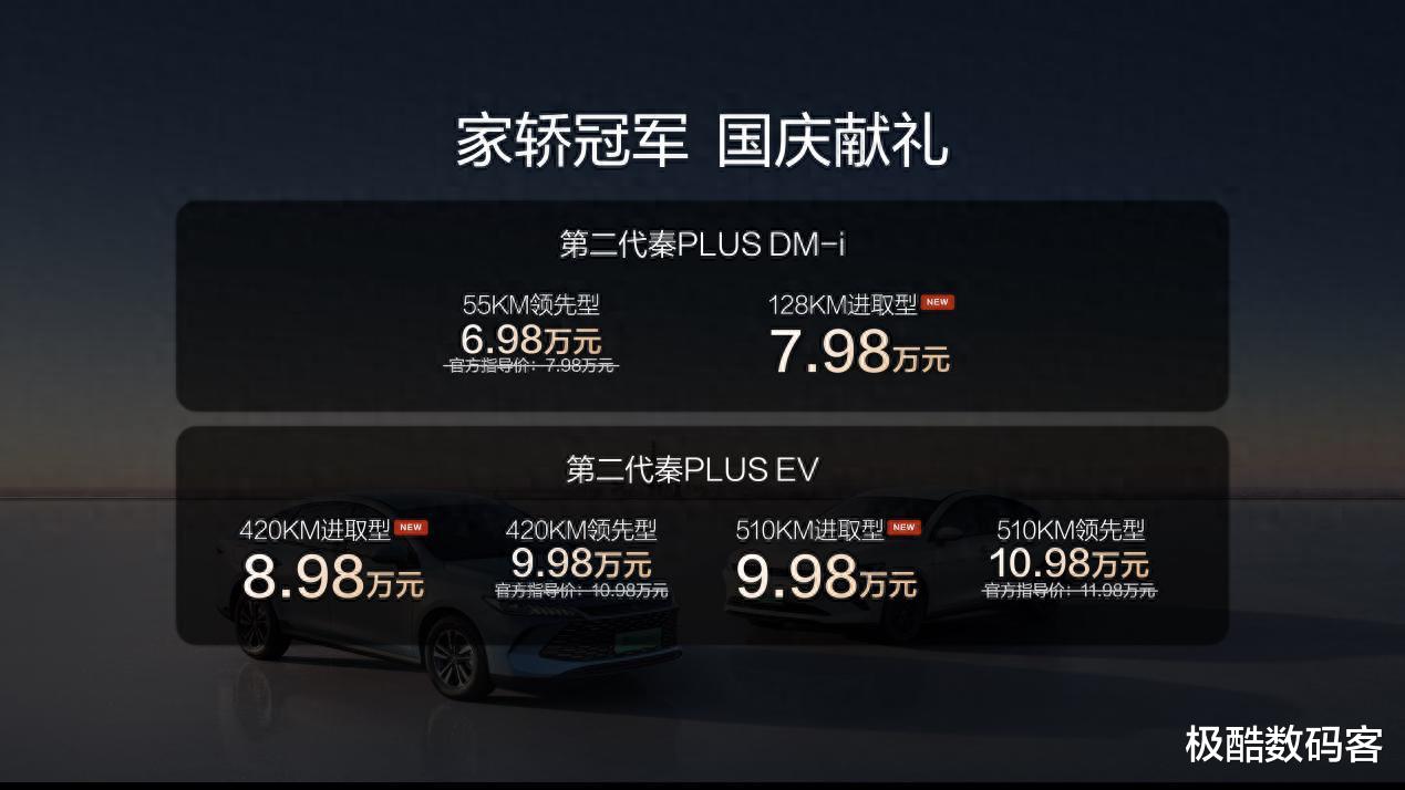 2025年9月25日,比亚迪正式推出第二代秦PLUS的三款新配置——秦PLUS DM-i 128KM进取型、秦PLUS EV 420KM与510KM进取型,全系同步启动“国庆献礼价”,全系车型以6.98万元起的价格刷新A级家轿价值标杆,让"中国质造"真正驶入寻常百姓家。