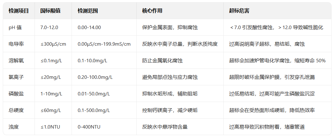 这 7 项指标构成热水锅炉水质的 “安全网”,任何一项异常都可能引发连锁风险,需同步监测、协同管控。