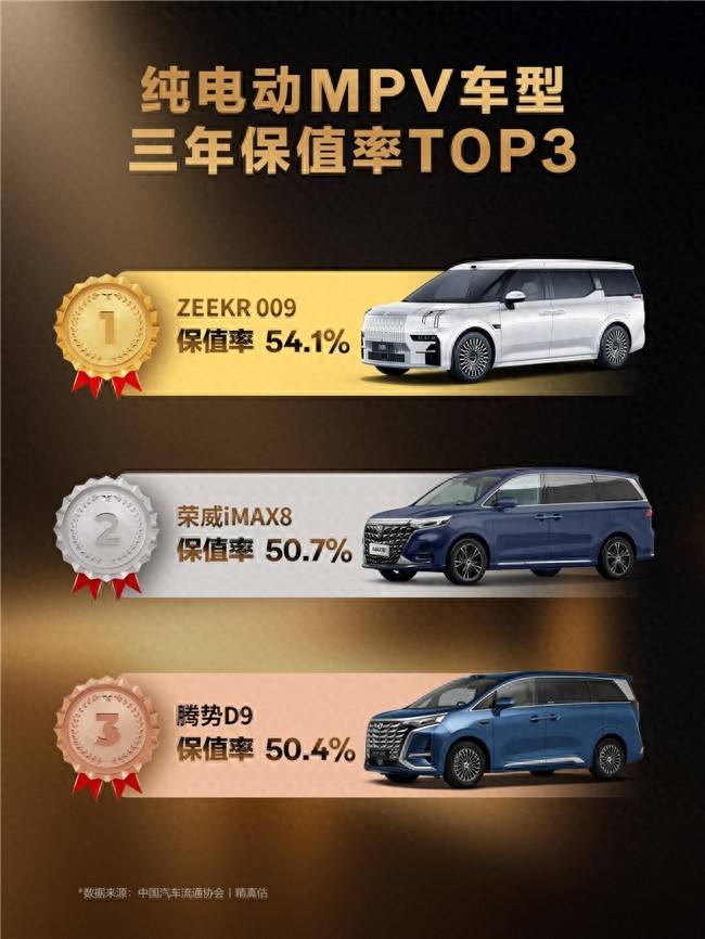 极氪009 54.1%排第一,荣威iMAX8 50.7%,腾势D9 50.4%也都还不错~MPV本来就不算特别保值的车型,009能到54%,确实挺能打。