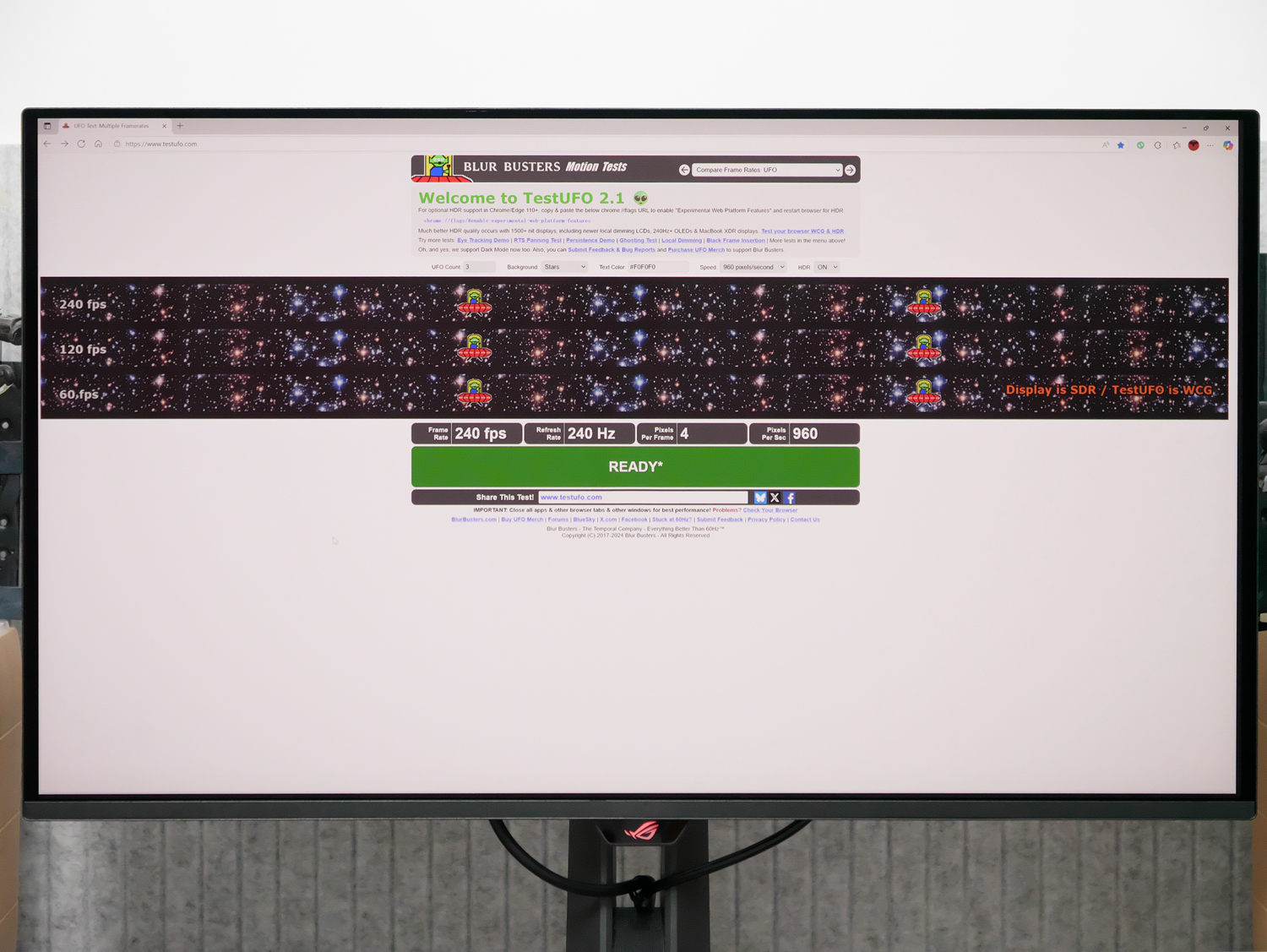 毫无意外,testufo网站的广色域与HDR兼容性测试轻松过关。值得一提的是,ROG超神X OLED的HDR功能支持进阶设置,不但可切换Dolby Vision或HDR10模式,而且每种模式下预设四种HDR风格(游戏/电影/主机/ TrueBlack400),更自由的是,点亮“HDR可调”功能后还能自定义HDR风格。