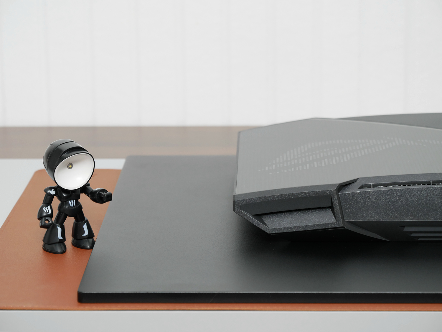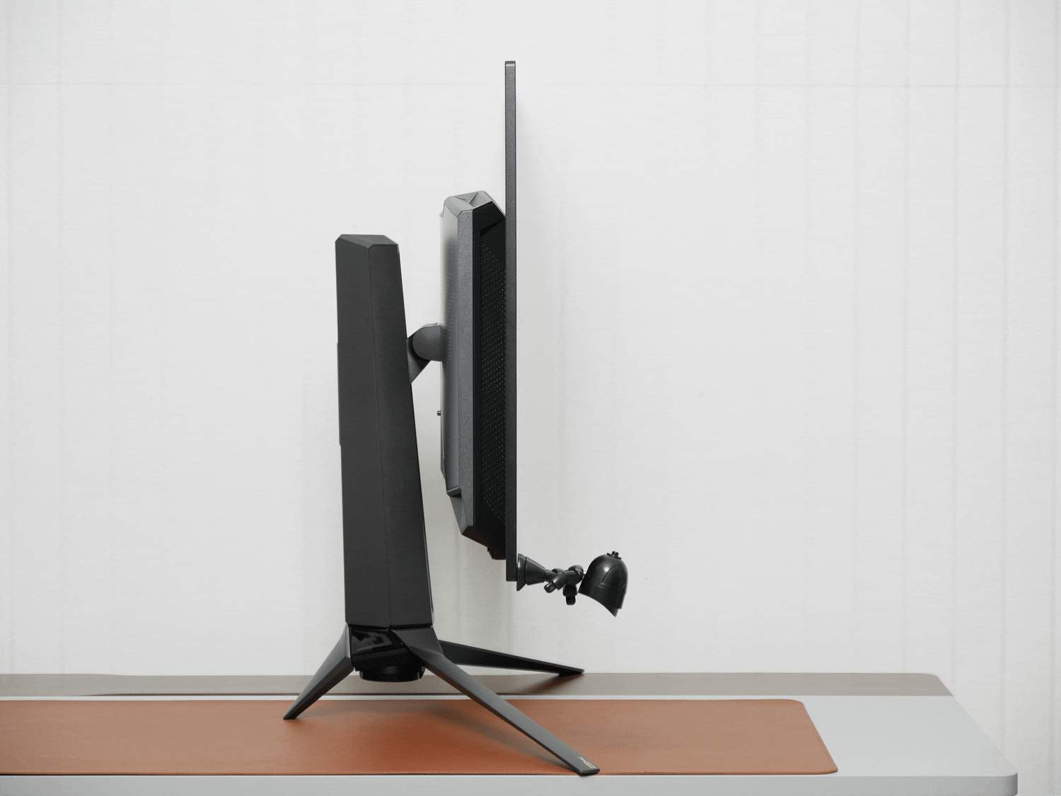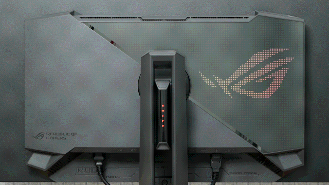 背面是黑色+灰色拼贴设计,灰色部分采用像素风装饰,象征着OLED的像素级控光,同时像素组成ROG标志,也是背面的RGB灯效区。有意思的是,支架的升降部件采用镂空&悬浮设计,有种科幻片里观光电梯的既视感,充满未来主义。