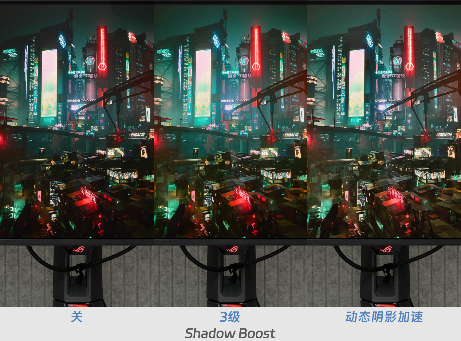 除了三个基本档之外,ROG还提供了“动态阴影加速”档位,基于AI算法,能在提亮暗部的同时,适当增加某些区域的对比度,肉眼可见的整个画面视觉更舒服,不至于因为提亮后导致低反差而影响观感。上图是Shadow Boost=关/3级/动态阴影加速三个档位的对比图,可见“动态阴影加速”档的暗部最亮,而且中灰区域的对比度也最高,画面整体观感更自然,也更契合游戏氛围。下面动图可以更直观的感受到,“动态阴影加速”档带来的画风变化。