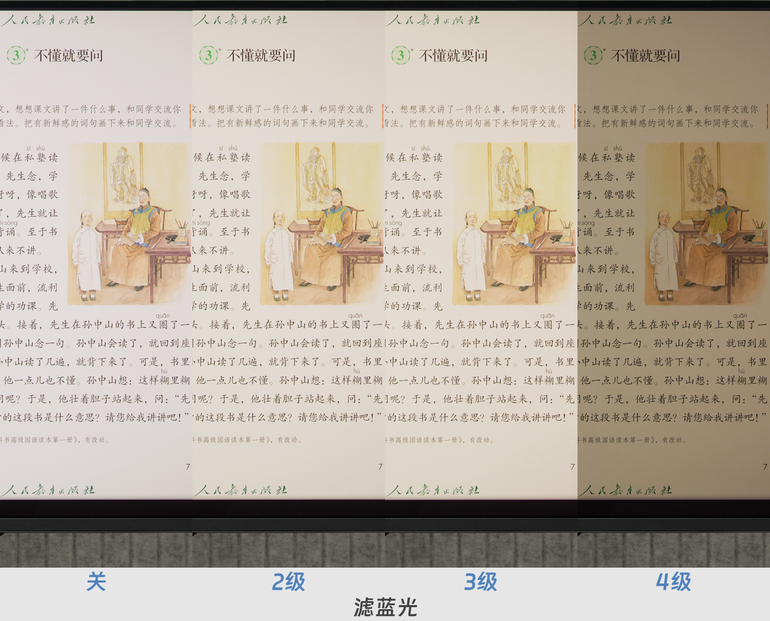 针对日常办公场景,ROG还额外提供4级滤蓝光功能,屏幕色温逐级变暖,护眼效果更好。下图是各档位的对比,可以看到明显的色温变化,同时在4级还会降低亮度,更契合暗光环境的用眼需求。