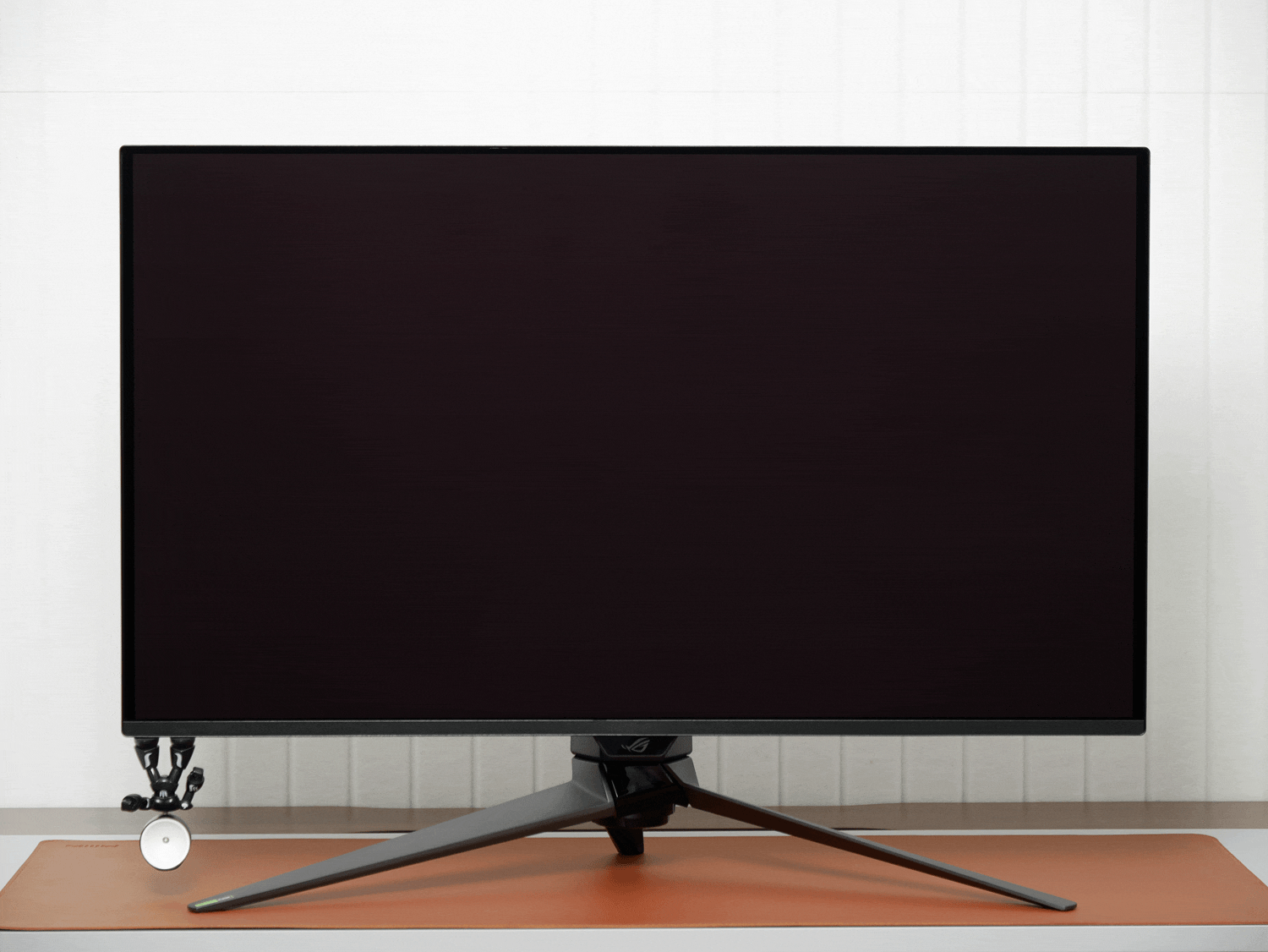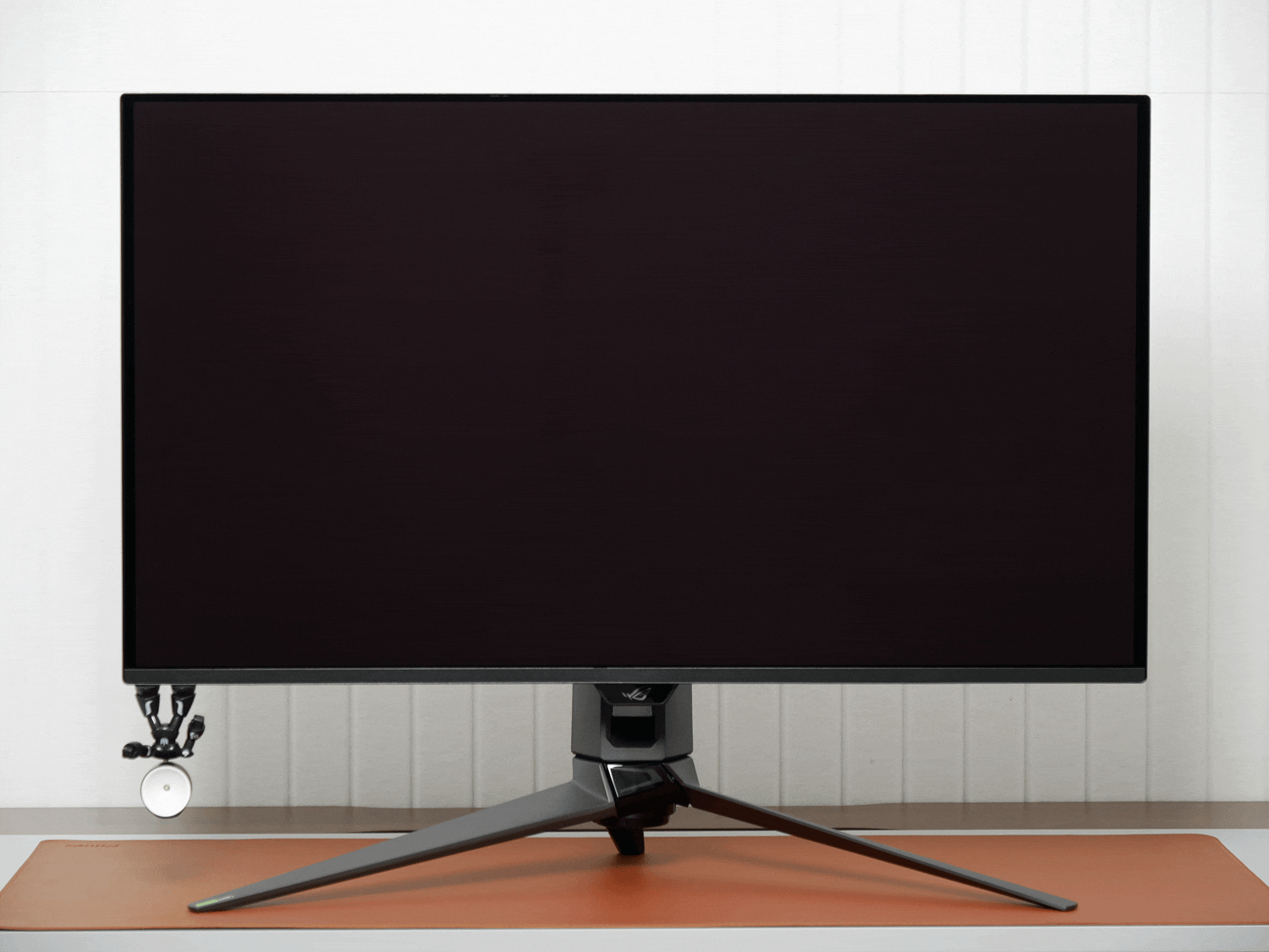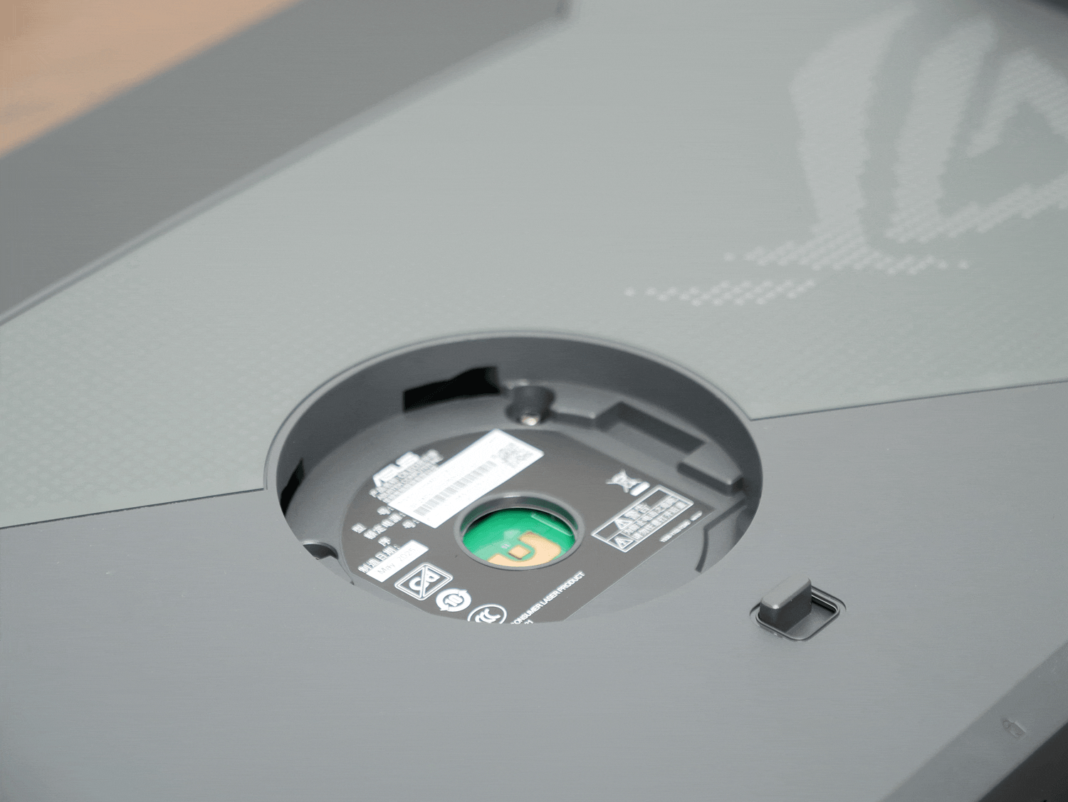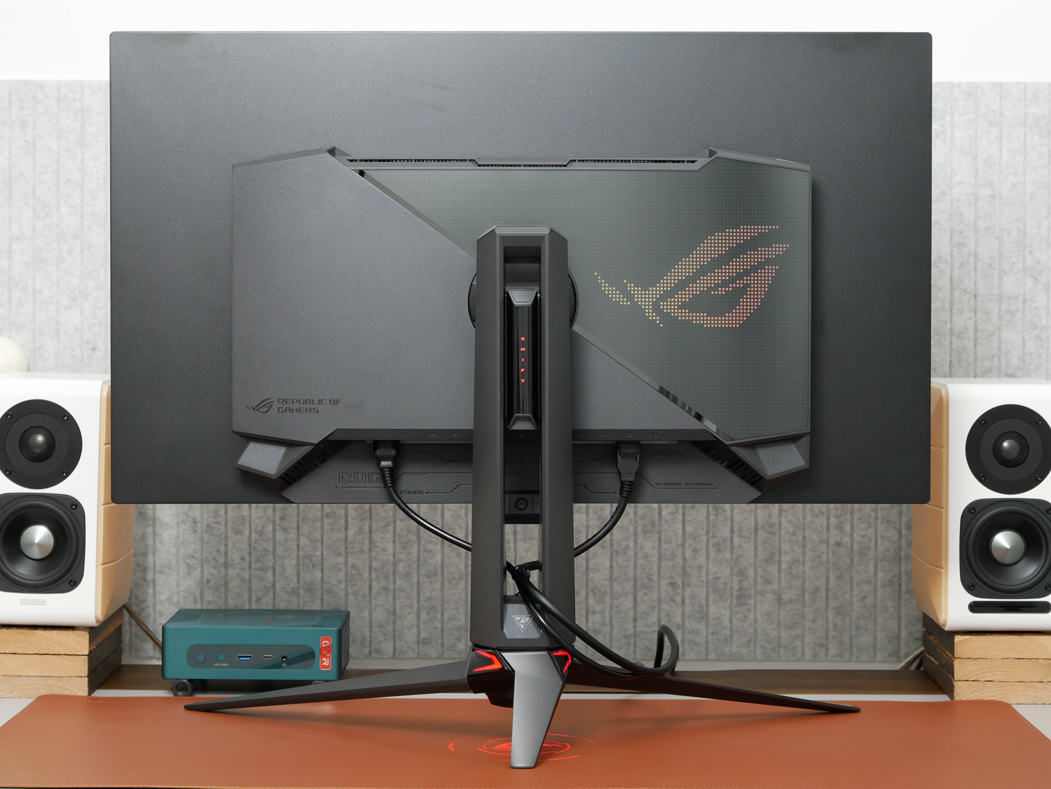 整机的灯效分为两部分:主灯区是背面的ROG标志彩色灯,除了OSD里的预设灯效,还支持Aura Sync神光同步;副灯区是支架升降部件与底座投影部件的红色灯,可在OSD里设置亮度或关闭。