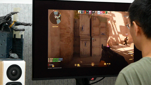 240Hz刷新率与0.03ms响应时间,注定了ROG超神X OLED是一位优秀的电竞搭子,特别适合快节奏且需要精确操作的游戏(FPS/RAC)。比如在《CSGO》里突突突,高速移动的场景画面没有拖尾断层,游戏画面顺畅,操控丝滑,简直不要太爽。等等,在31.5英寸大屏玩《CSGO》你是认真的?别着急,较瘦已切换到24.5英寸模式!