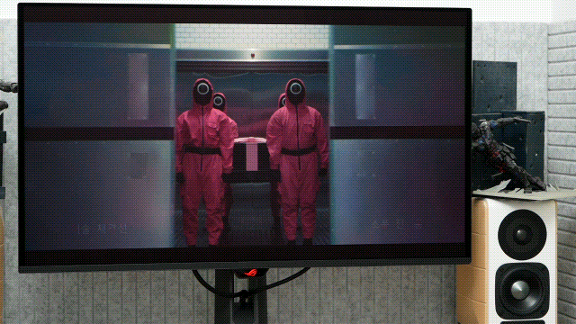 再来看看年度话题大作《鱿鱼游戏 第三季》,QD-OLED屏幕的高对比度优势,能清晰呈现画面中亮部与暗部的细节,让游戏道具的纹理栩栩如生,搭配冷暖色调的对比,营造出既绝望又刺激的游戏体验,让观众也跟玩家一样,带着恐惧与期待走进下一关。