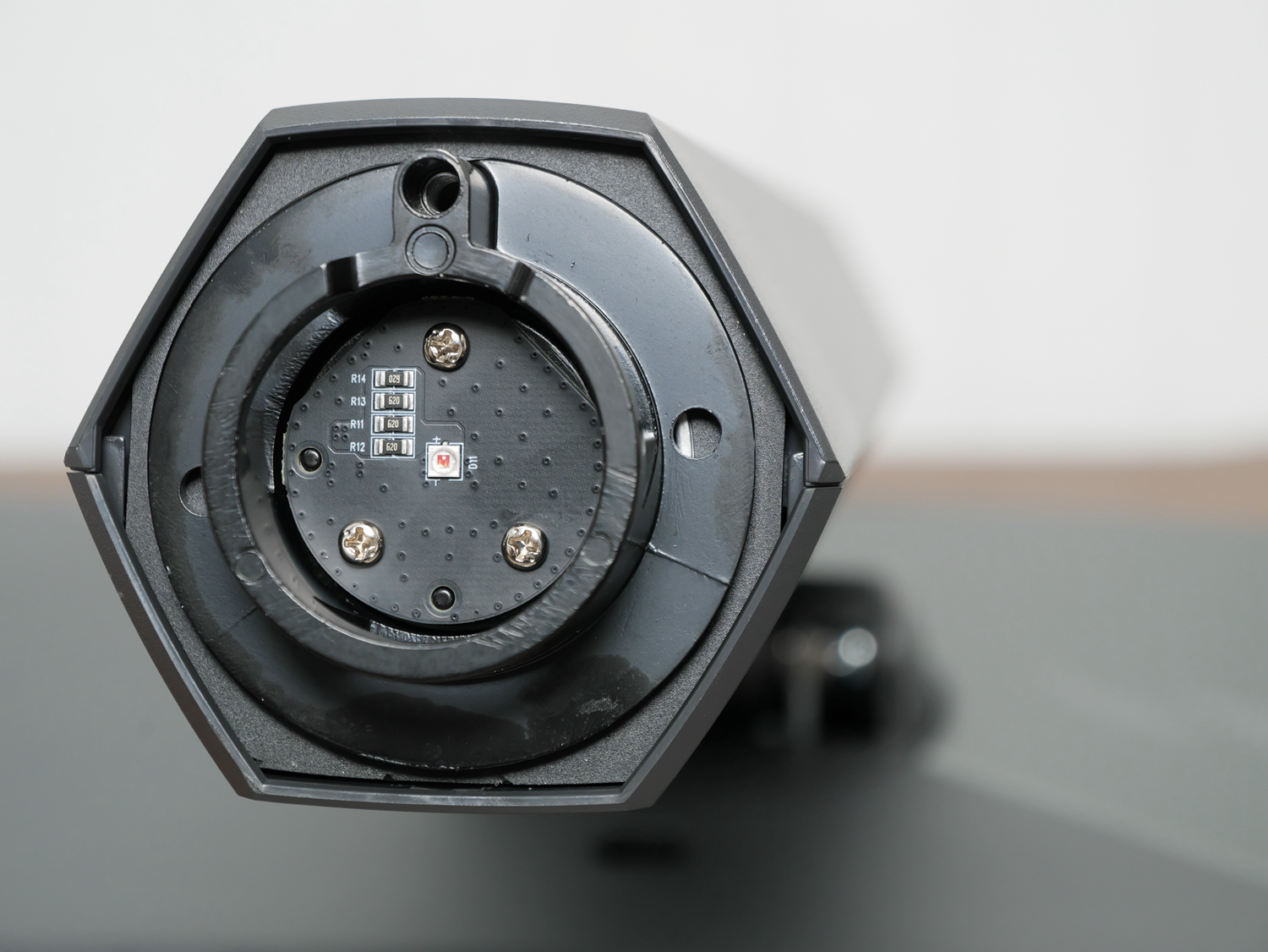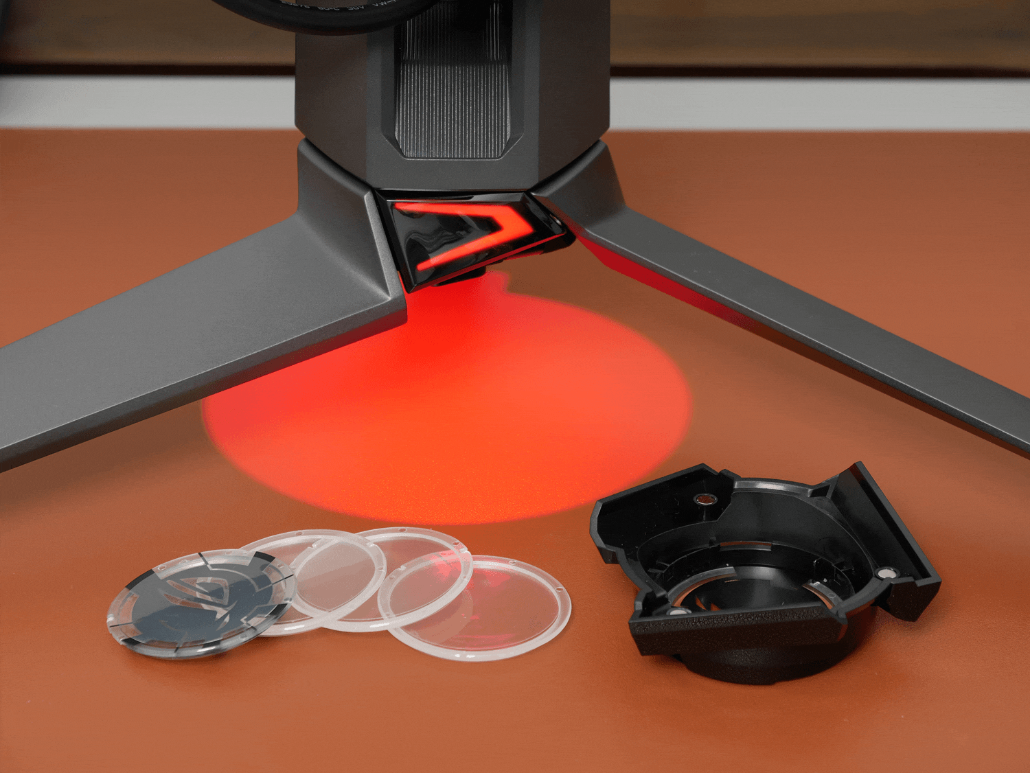 最后是底座投影部件,支架底部设有红色LED灯珠,驱动红光辐射到底座的两个灯区,一个是中央的半透明装饰块,一个是底部的可替换投影片。