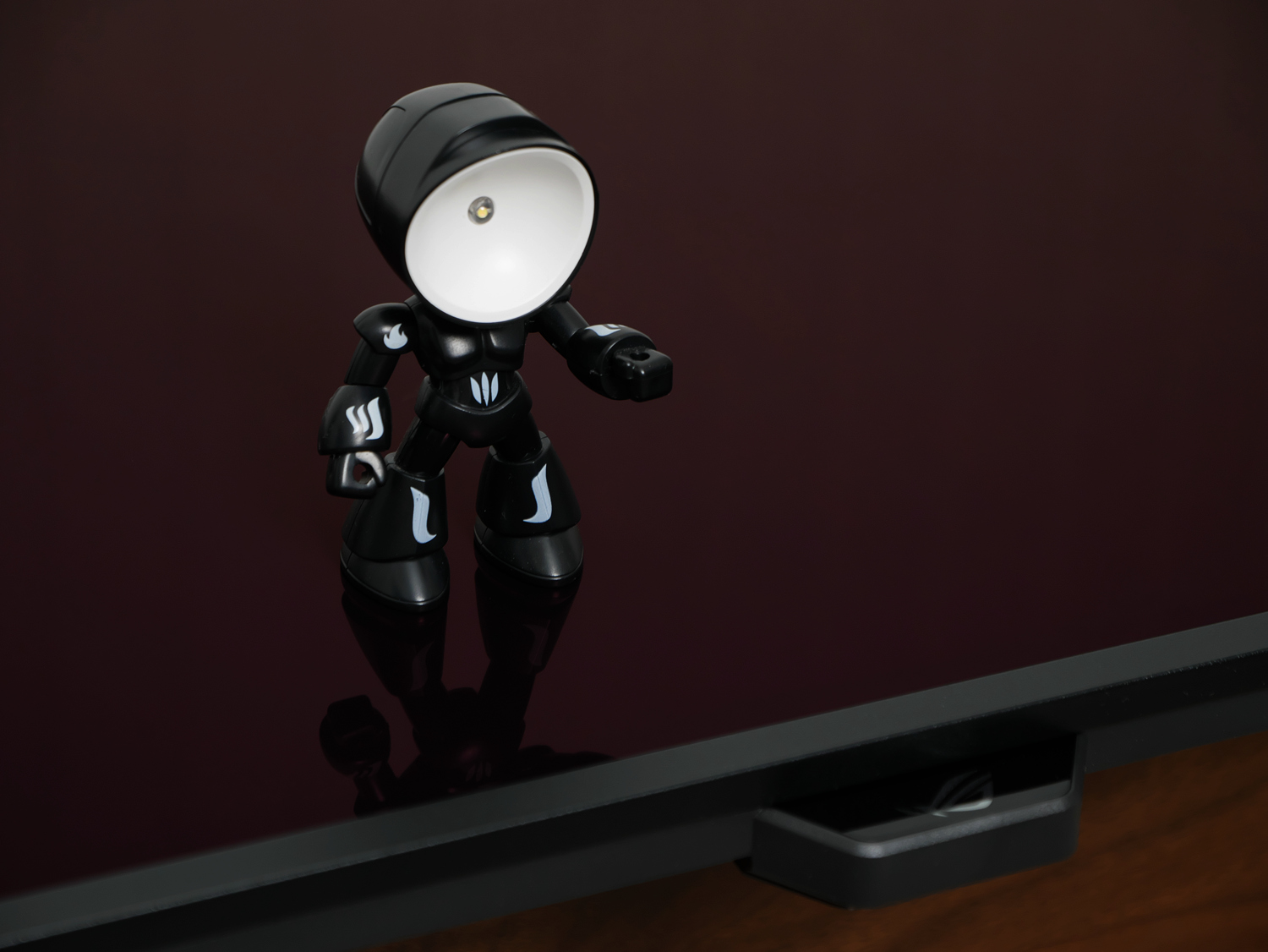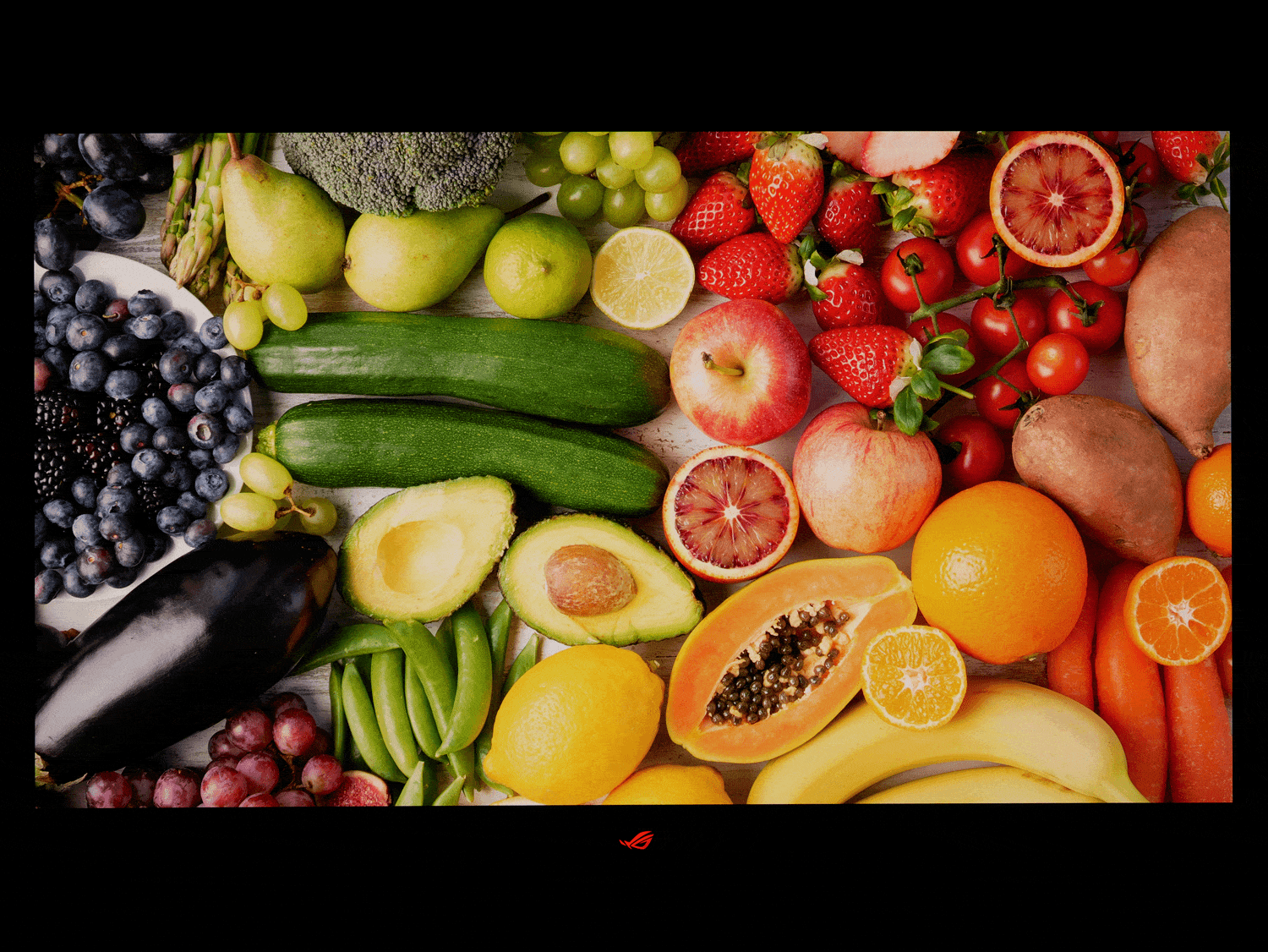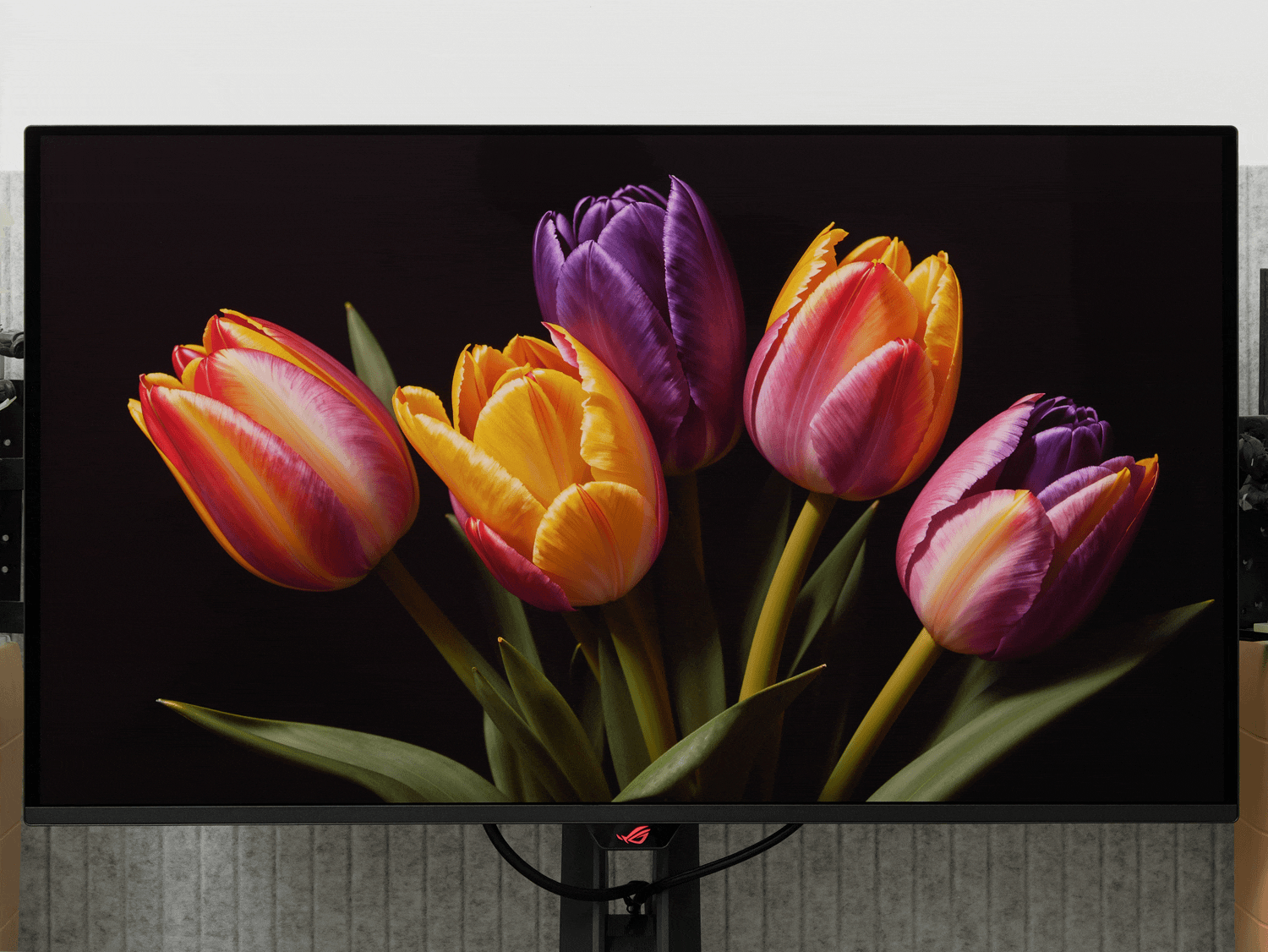 OLED面板采用有机发光二极管,能实现LCD梦寐以求的像素级控光,带来非常纯粹的黑色。在暗光环境下,ROG超神X OLED加持1500000:1的超高对比度,完全找不到一丝漏光,感觉就像显示器关机一样。比如下面的黑底图片场景,对比环境灯亮/灭的情况(曝光参数均为ISO200、F8.0、1/8s),画面的黑底深邃到了极致,关灯后画面背景与环境融为一体,只剩下依然艳丽的那些花儿与ROG的信仰logo。