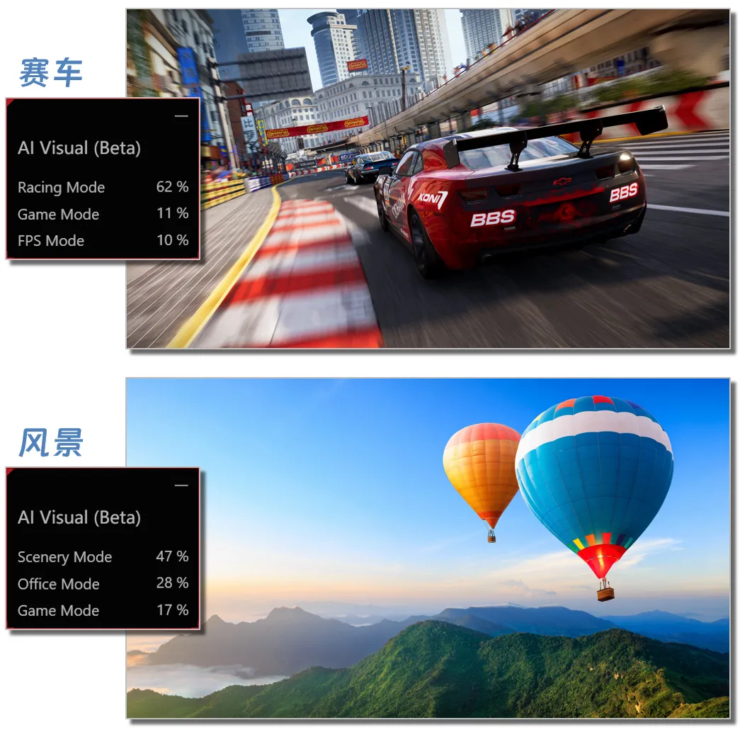 解药来啦!ROG在常规显示模式的基础上,增加了AI Visual模式,它会实时分析画面内容,并智能判断应用场景的可能性,然后自动切换到最匹配的画面模式。比如画面中出现赛车或赛道,AI判断当前场景有62%的概率是竞速游戏,会将画面模式切换到“比赛模式”。