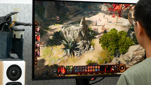 再来耍耍《博德之门3》,RPG类游戏对刷新率与响应时间的需求没那么迫切,倒是更能体现大屏幕×高画质的优势。ROG超神X OLED的超强解析力与卓越色彩还原,在31.5英寸大屏上表现得淋漓尽致,不但让游戏里的魔幻元素栩栩如生,而且带来堪比大片的沉浸感,连对话场景都更好看啦,不忍心空格略过。