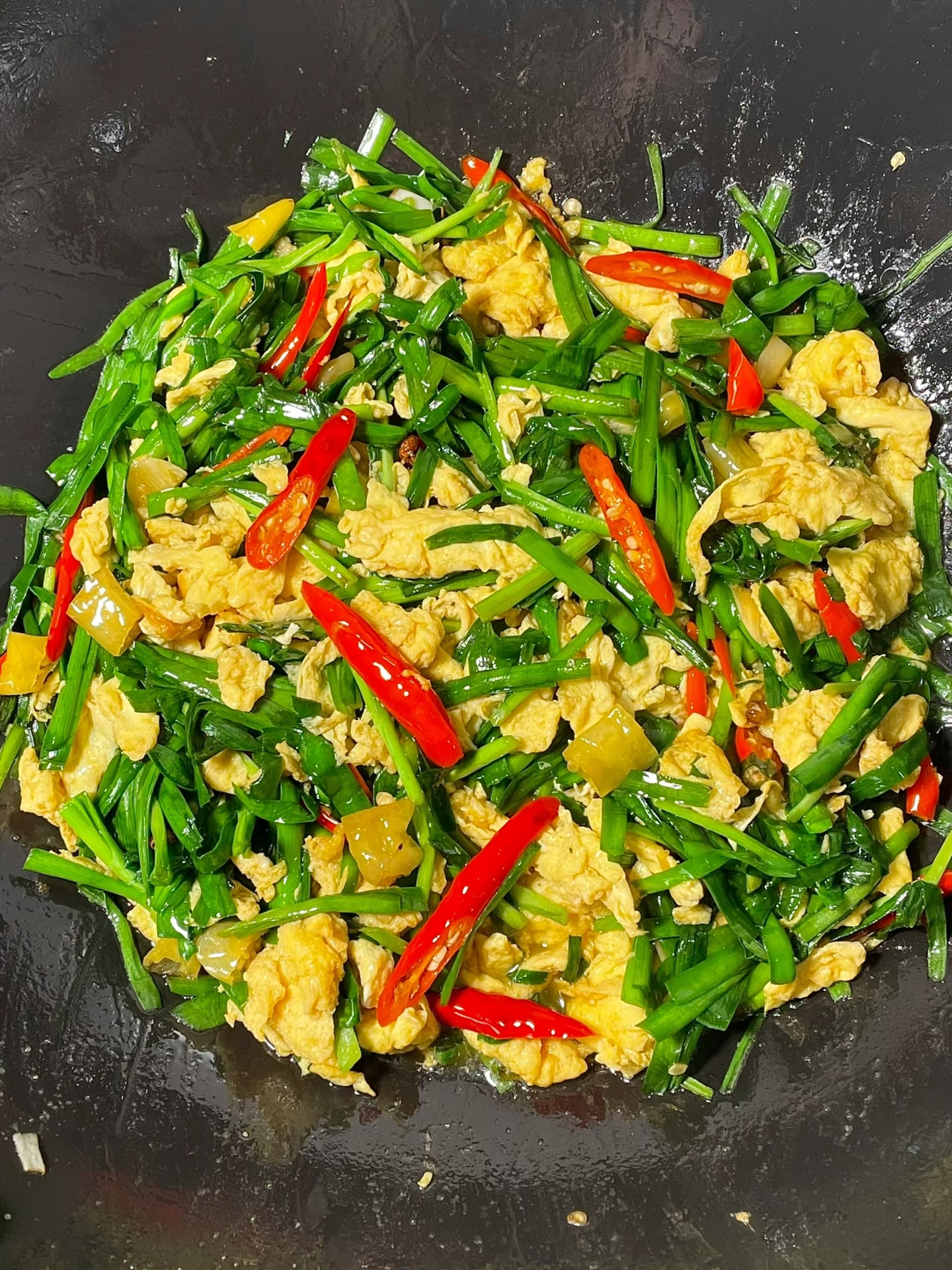 第四步:炒韭菜。锅里再加点油(不用太多,因为鸡蛋已经吸过油了),油热后把韭菜倒进去。重点来了!韭菜下锅后要立刻大火快炒,用铲子不停翻动,让每一片韭菜都能均匀受热。炒韭菜讲究“快、准、狠”,整个过程不超过一分钟——看到韭菜叶片变软、颜色变得更深绿时,赶紧进行下一步。