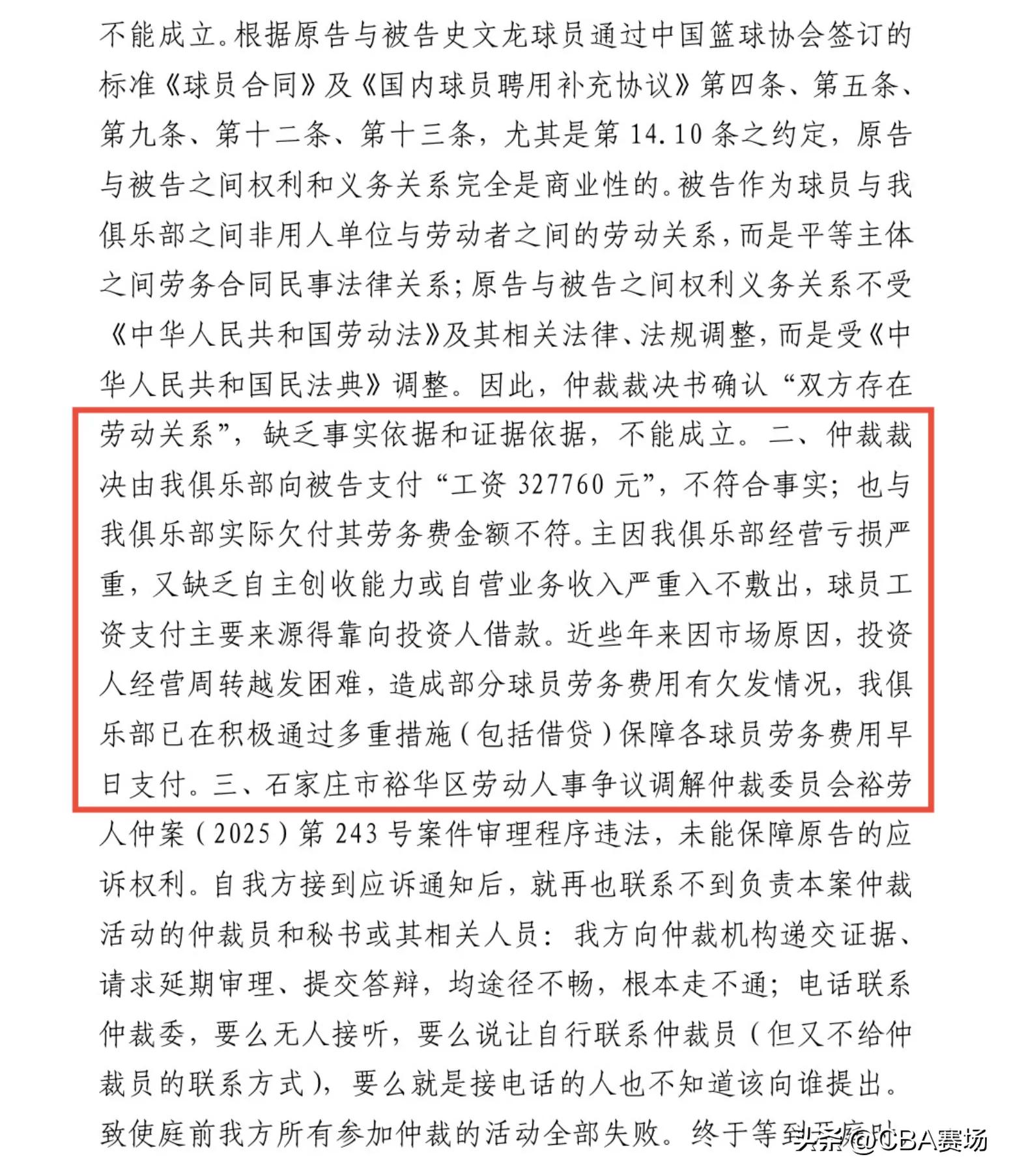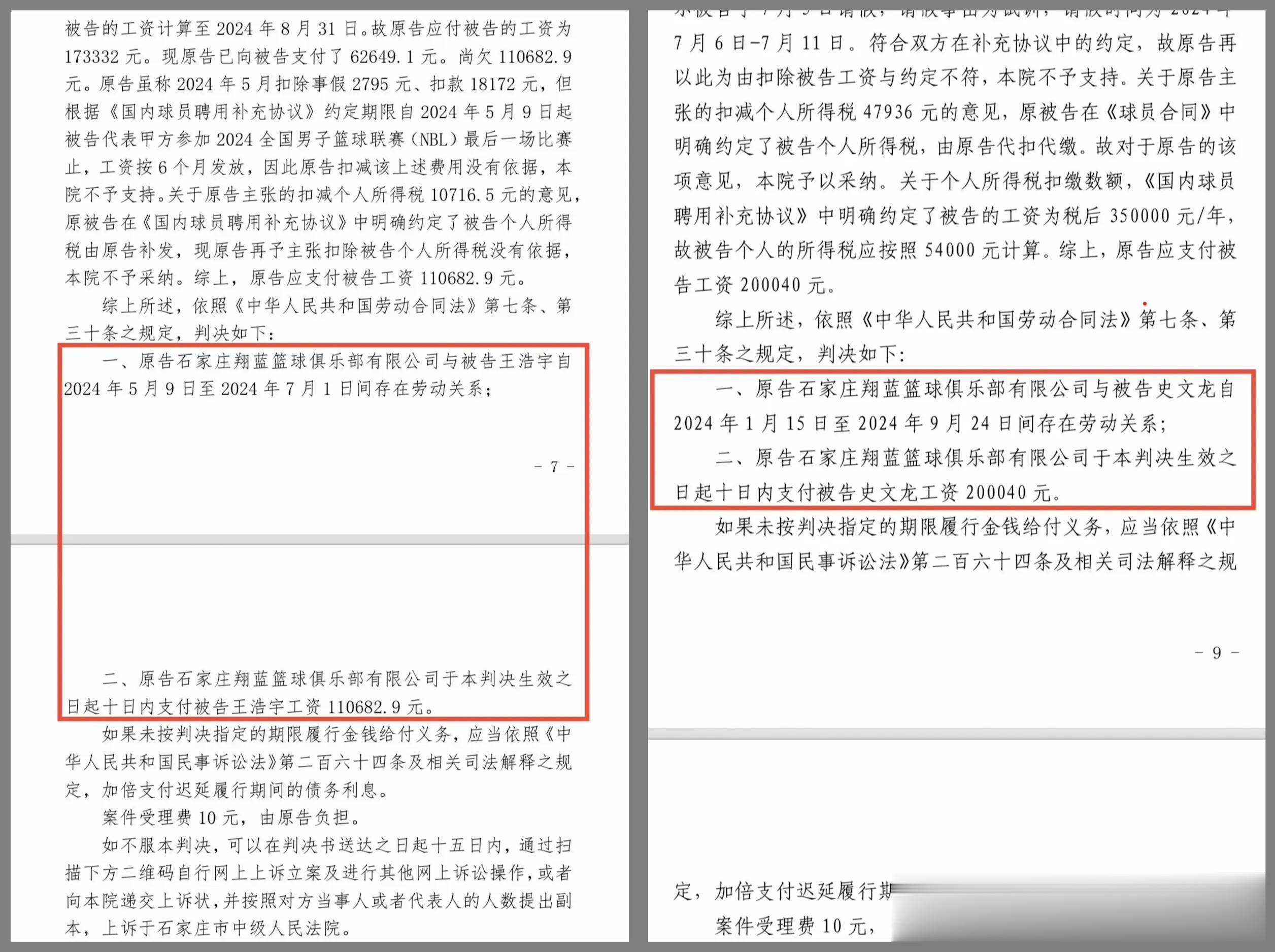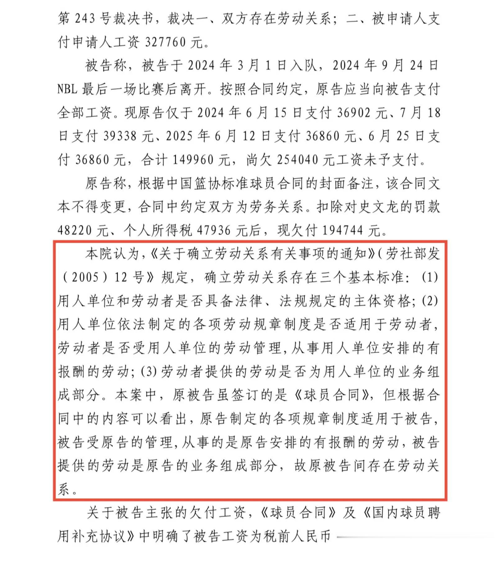 可俱乐部仅补发两月工资便反悔起诉,宋帅、张正昕无奈接受调解,约定分期结清薪资,却再度遭遇违约,约定付款日期一拖再拖,如今俱乐部已失联,二人只能申请强制执行。史文龙与王浩宇坚持应诉,一审法院同样认定劳动关系成立,判令俱乐部支付二人共计超31万元欠薪,俱乐部却不服判决提起上诉,主张双方为劳务关系,应归篮协仲裁而非劳动法管辖,目前二审仍未开庭。