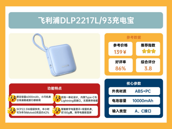 飞利浦这款充电宝走的是“小而实用”路线。它的10000mAh电池在便携型中算充足,但体积却接近银行卡大小,重量只有180g,放兜里都没负担。机身自带Type-C和Lightning双线,不需要另外带线,平时直接拎着就能出门。小屏幕能精确显示剩余电量,用起来比那种四灯指示直观很多。