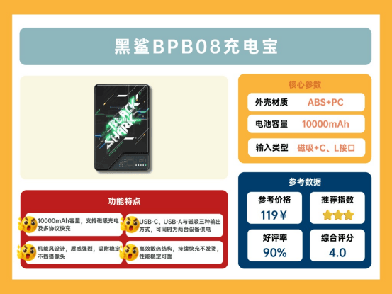 黑鲨这款充电宝延续了游戏品牌的风格,外观带点机能感,黑色亮面配印花图案挺有辨识度。它支持磁吸充电,吸附力强,用在iPhone或部分安卓磁吸壳上都很稳,不容易掉。10000mAh容量能满足日常使用,不过它没有自带线,非磁吸设备需要额外准备线材。