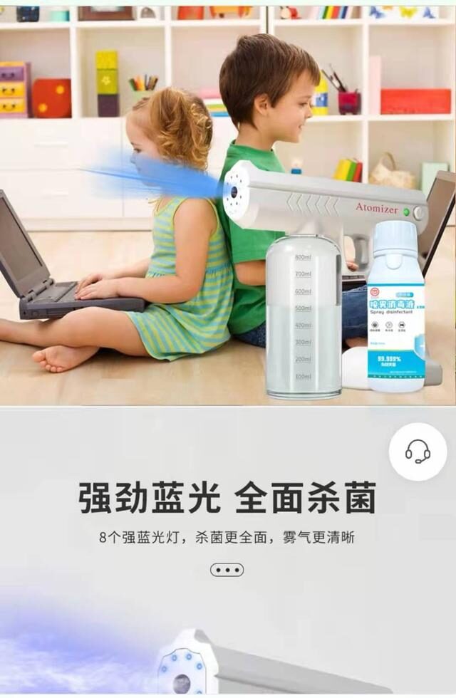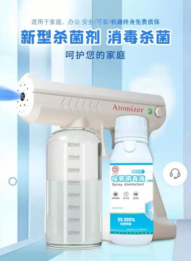 检测报告数据杀菌率为99.999%。配合蓝光消毒枪,喷洒方便,蓝光照到哪里就可以喷到哪里。