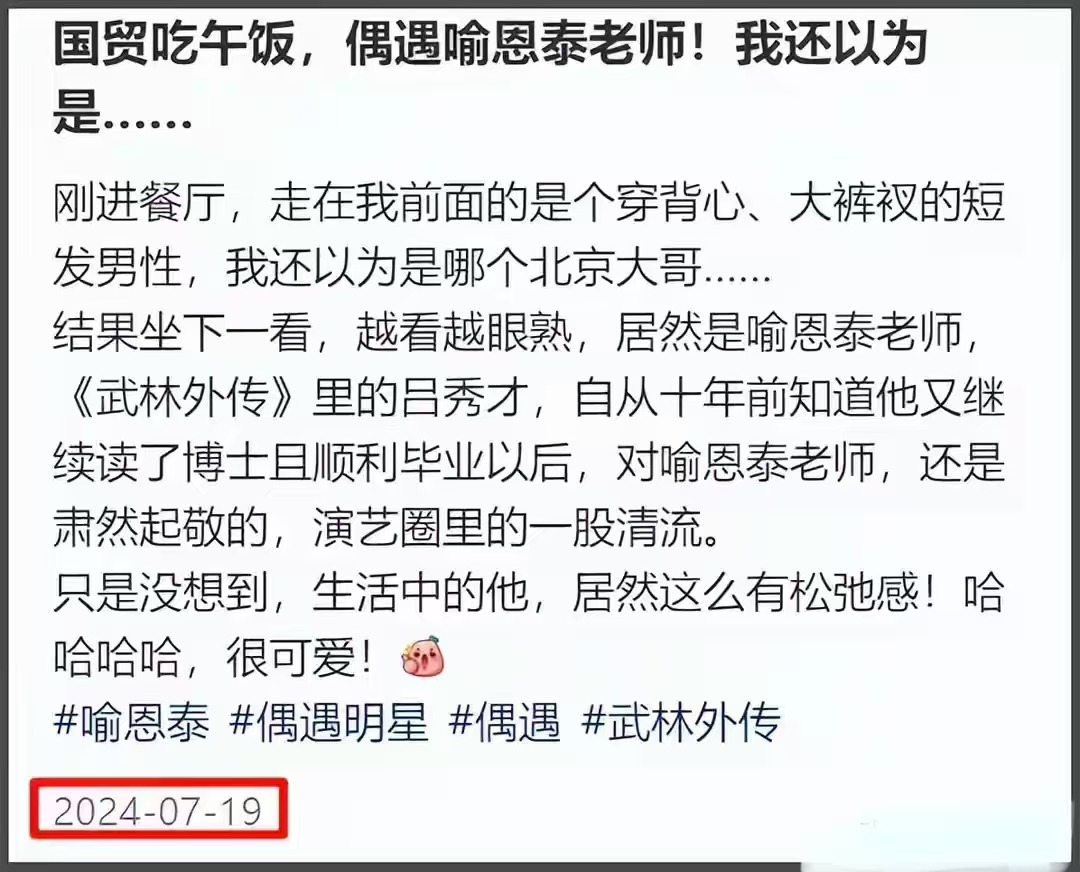 而去年喻恩泰却被网友拍到他跟一位小美女私会,那段时间正是喻恩泰和史林子分居的时间段。喻恩泰带着小美女去吃饭,虽然穿着随意,但是消费却不一般。