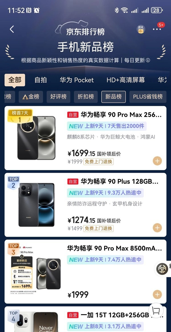 你刷京东的时候,有没有盯着那个“手机新品榜”多扫两眼?3月31号晚上11点整,截图还在网上疯传——前三名,清一色华为畅享90系列。不是拼单、不是导流、不是刷榜,就是实打实的销量实时排名。榜首是华为畅享90 Pro Max(256GB),第二是畅享90 Plus,第三又绕回来,是另一个配置版本的畅享90 Pro Max(无国补)。这事儿不夸张,但挺让人晃神:千元机赛道,什么时候这么卷过?