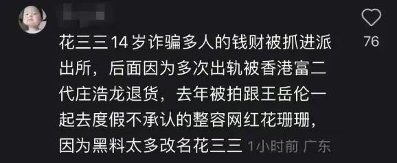有网友直接扒出来花三三的过往黑料,未成年就参与诈骗,后来进入豪门又多次劈腿出轨,被富二代退货…可见其成色如何。