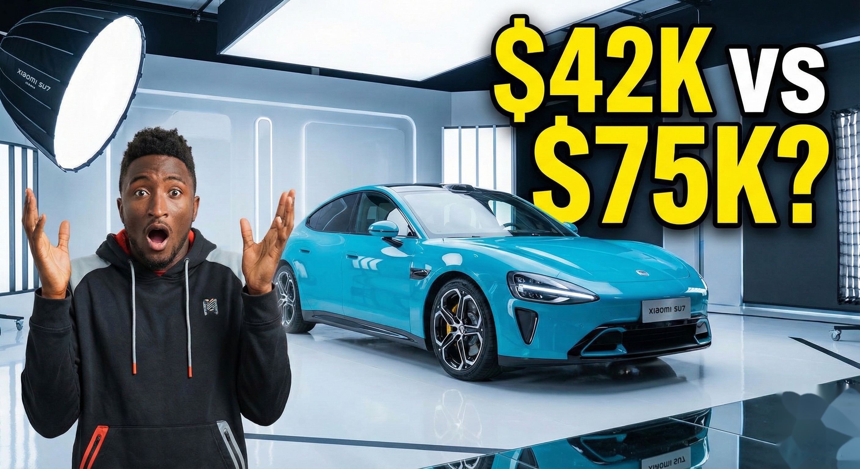 他指着这辆流线型极美的 SU7 说: “在中国,这辆车的起售价大约是 21.5 万人民币,折合美元只要 4.2 万。”