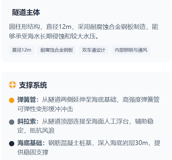抗风浪能力强:悬浮式结构可减少海浪直接作用在隧道上的冲击力,斜拉、弹簧管和弹簧系统共同作用,保证隧道在恶劣海况下的安全稳定。