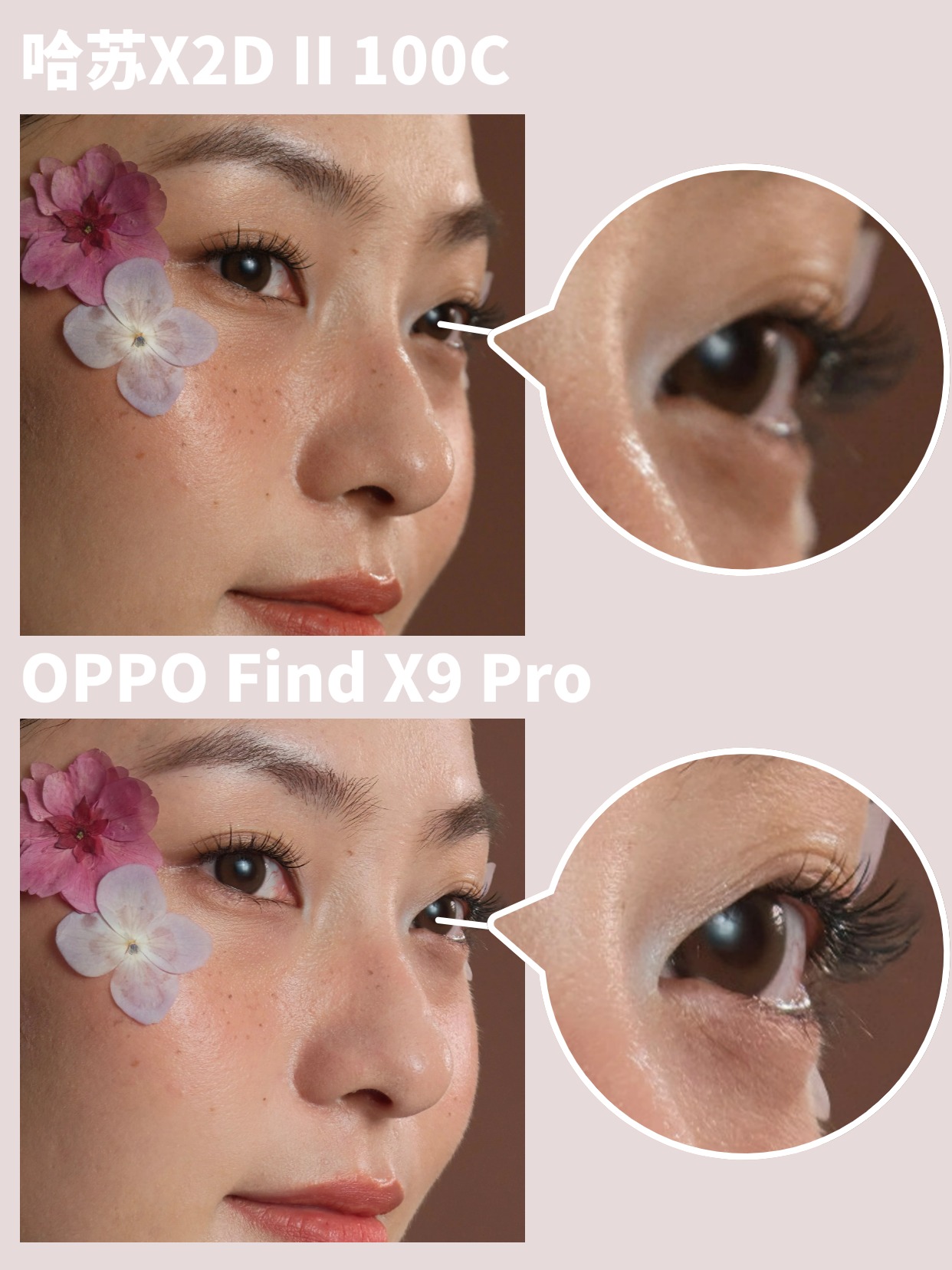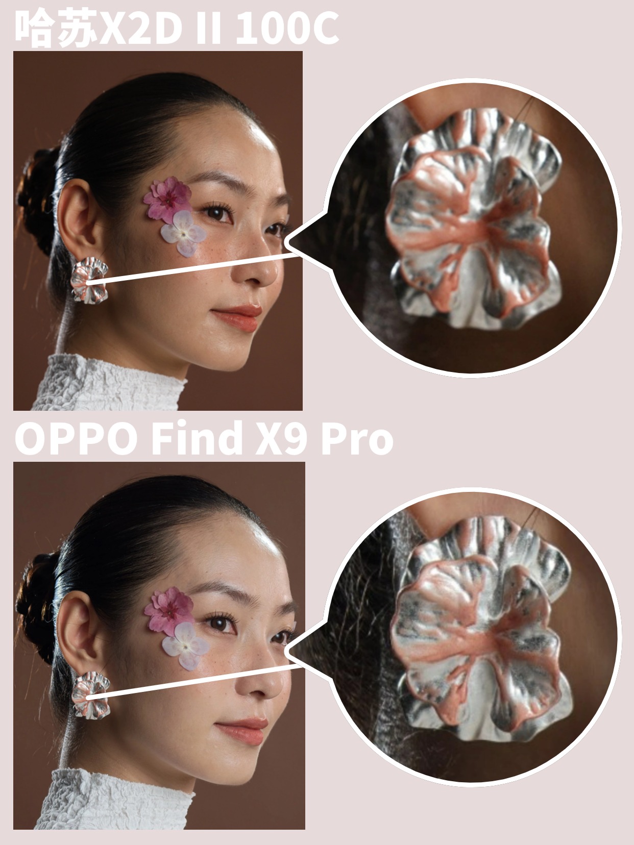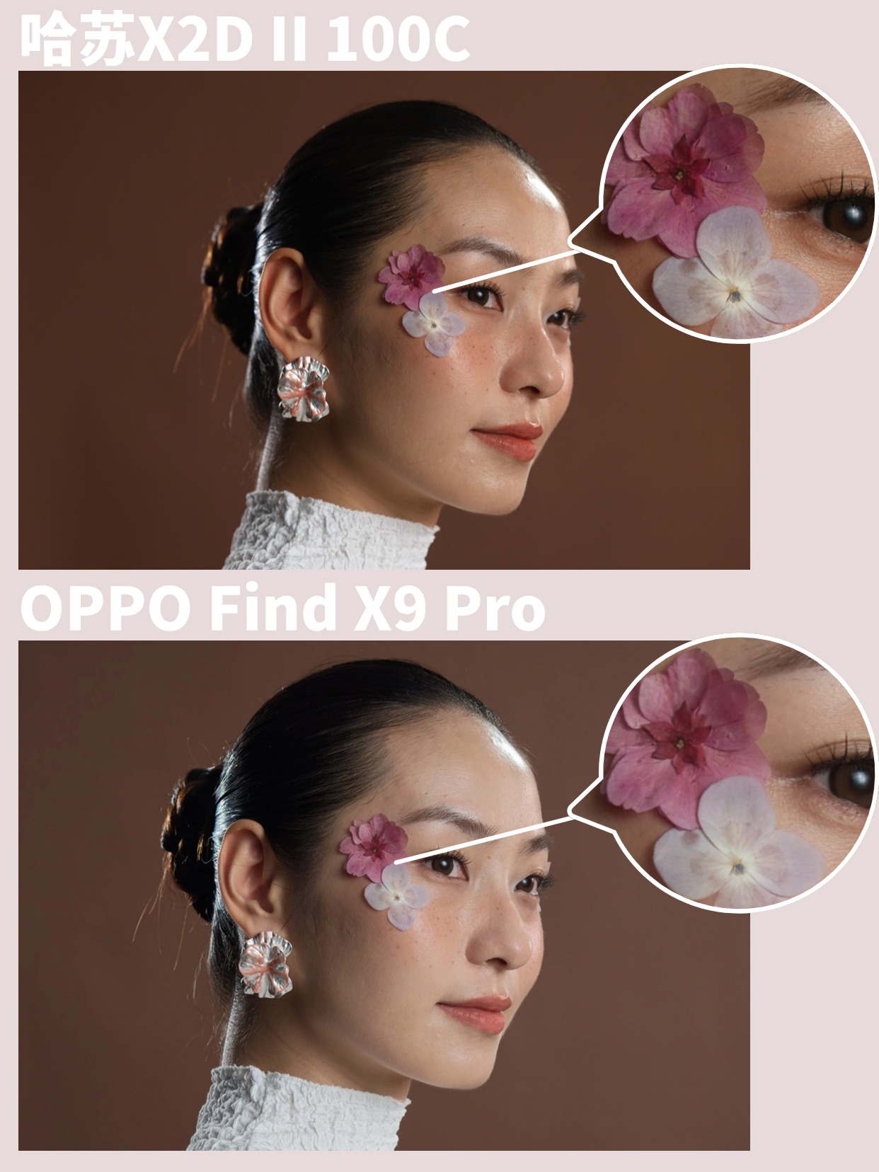 拿周意保分享的原图放大放大再放大,面部点缀的花蕊、佩戴的耳饰细节都拍的一清二楚,甚至OPPO Find X9 Pro在眼部处理上还要比哈苏X2D II 100C更清晰,这成像解析力真就坐实“OPPO X9D”了,“OPPO哈苏画质王”诚不欺我!不知道看到OPPO Find X9 Pro这拍照表现,友商压力大不大,影像党们又如何评价呢?
