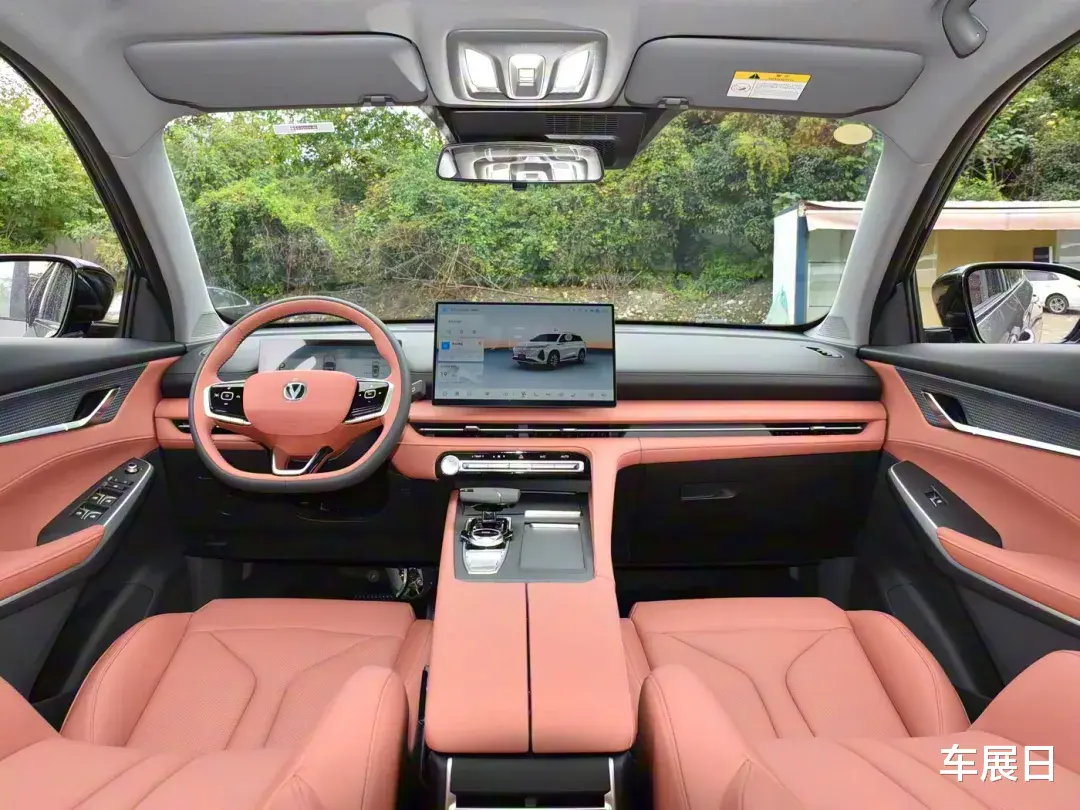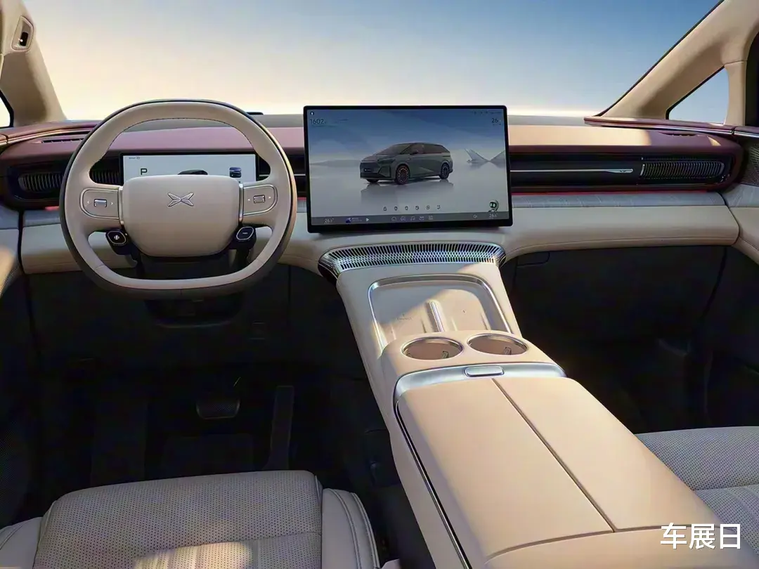 内饰采用星舰寰宇智舱设计,17.3英寸中控屏+10.25英寸液晶仪表屏,搭载高通骁龙8295P座舱芯片;玫瑰红搭配米色内饰配色;全新设计方向盘;二排双零重力座椅,扶手内侧有调节按键;21.4英寸二排娱乐屏;三排支持座椅调节、靠背折叠、翻转收纳,可4/6翻折收纳。