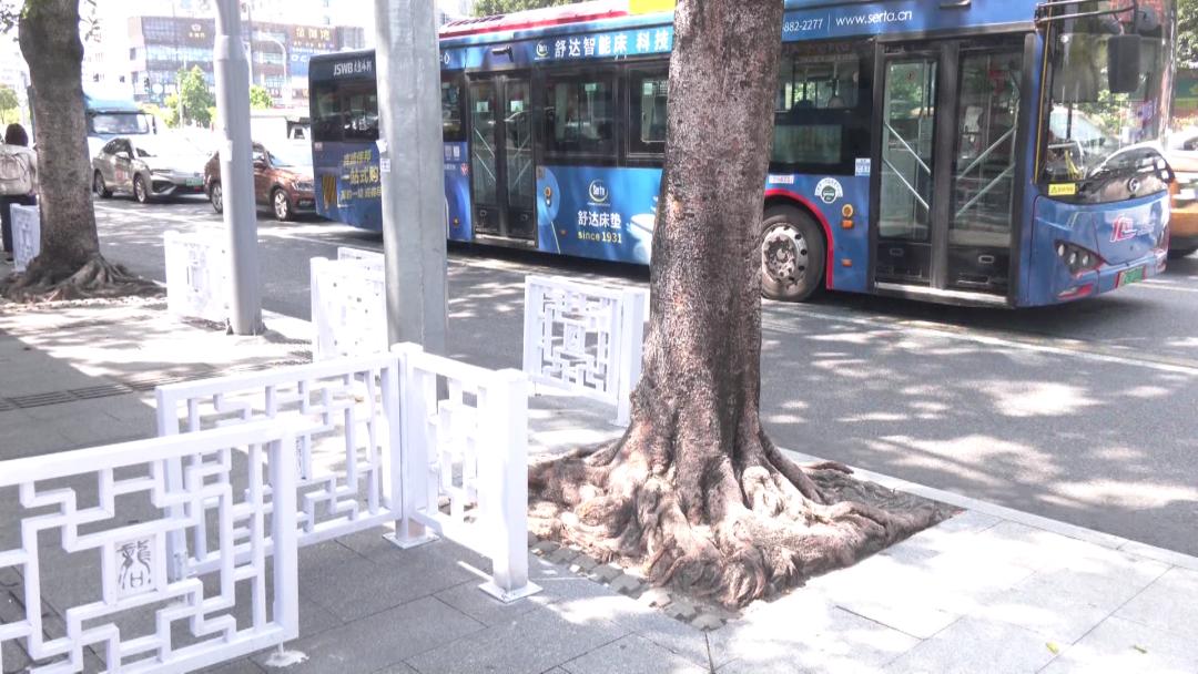 据市民爆料及记者走访,龙洞地铁植物园站、龙洞片区其他多个公交站台均安装了此类 S 型护栏,护栏高度约五六十公分,呈弯曲排列于人行道与站台前沿,相邻护栏间留有五六十公分缺口供通行。现场可见,护栏给出行带来明显困扰:电动车行至此处需调头绕行或碾压树池强行通过,导致树根出现磨损痕迹;更有市民指出部分护栏直接阻断了盲道,影响无障碍出行。