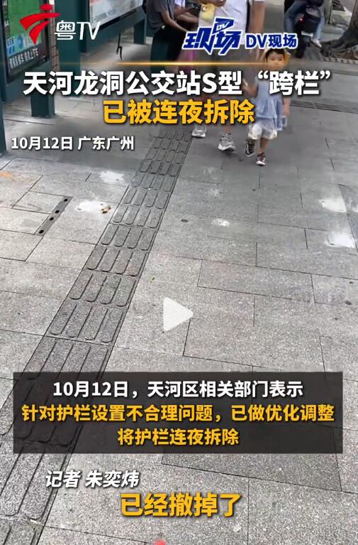 10 月 11 日,广州市天河区龙洞片区多个公交站台出现的半米高 S 型护栏引发市民关注,不少街坊反映护栏影响通行,对其用途提出质疑。仅隔一日,涉事护栏已被连夜拆除,相关街道就此事致歉并承诺优化整改。