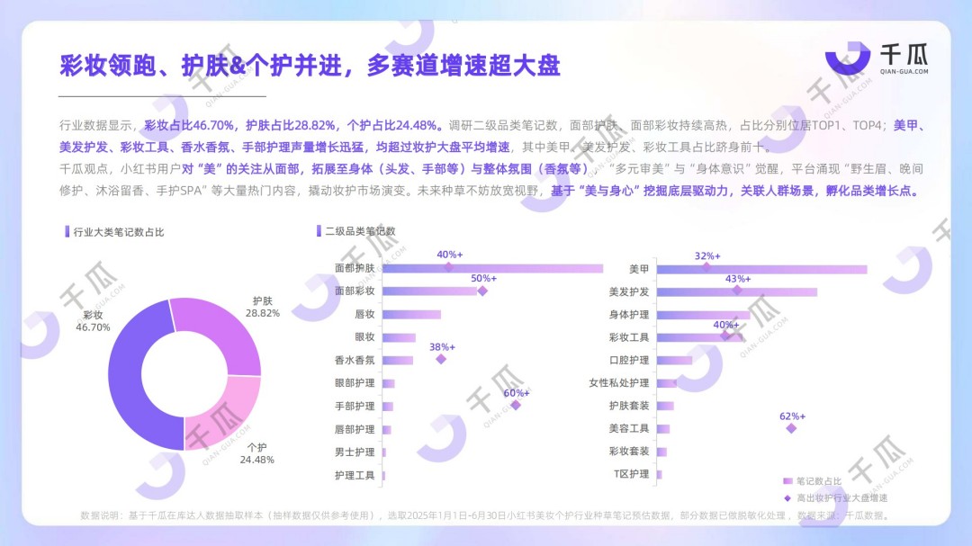 2025年上半年,小红书美妆个护内容呈现三足鼎立态势:彩妆以46.7%的占比稳居首位,护肤与个护分别占据28.82%和24.48%。值得注意的是,美甲、美发护肤、彩妆工具等细分品类增速显著,均超过行业大盘平均水平。