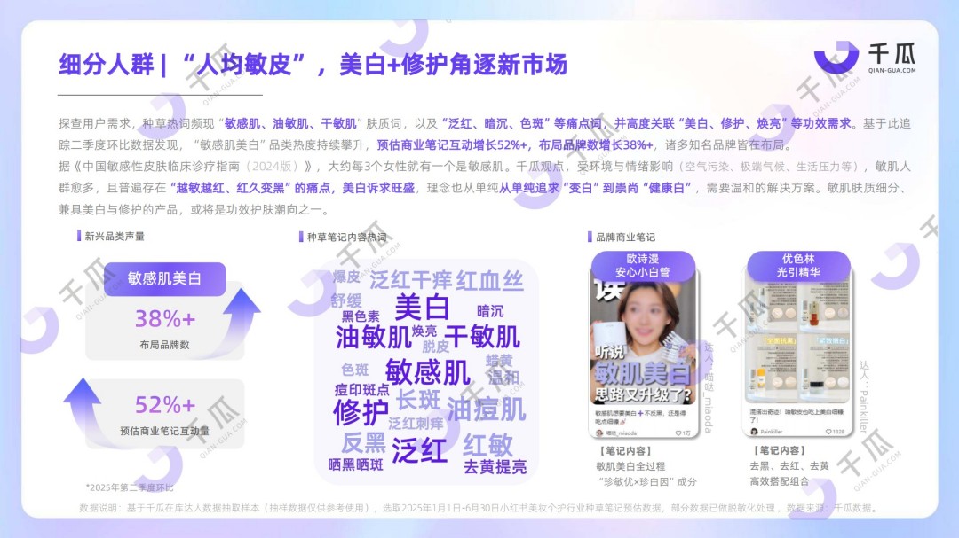 报告显示,约每3位女性中就有1人为敏感肌,"泛红、暗沉、色斑"是核心痛点。2025年第二季度,"敏感肌美白"品类迎来爆发式增长,商业笔记互动量预估增长52%+,布局品牌数增长38%+。