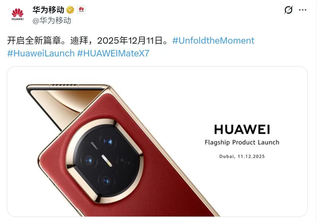 就在不久前,华为正式确认:Mate X7将于2025年12月5日开售。而就在国内发布日期刚刚落定,华为海外官方平台也同步宣布:将于12月11日在迪拜举行全球发布会!