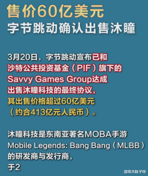 字节跳动放弃游戏行业,将手游业务60亿出售,旗下还有一款热门游戏,3月20日,全球游戏行业再起波澜。根据外媒消息,字节跳动已达成协议,将旗下核心游戏资产沐瞳科技以约60亿美元出售给沙特主权财富基金PIF旗下的Savvy Games Group,这笔交易不仅金额巨大,也在战略层面释放出清晰信号:字节正在加速退出游戏赛道。