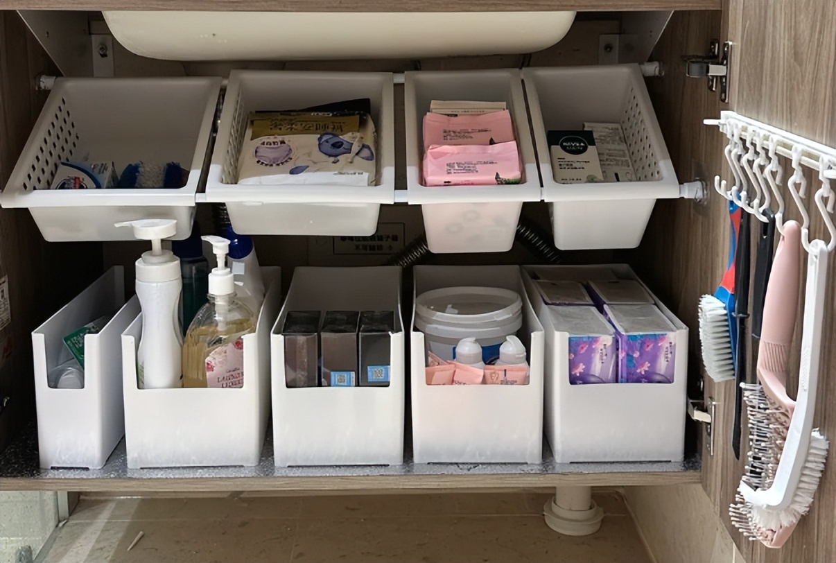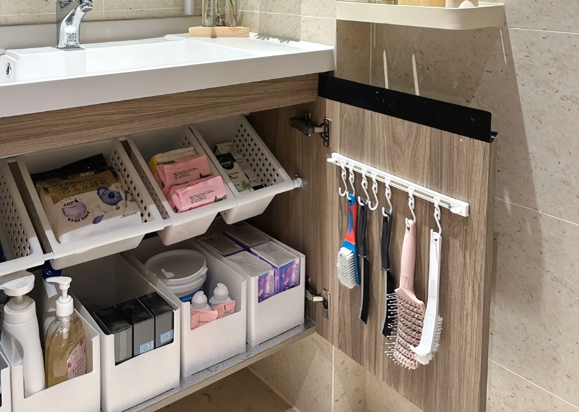 如果你觉得浴室柜的设计不合理就可以额外的去买各种收纳盒,一定要测量好尺寸,避免占地方或者不符合。