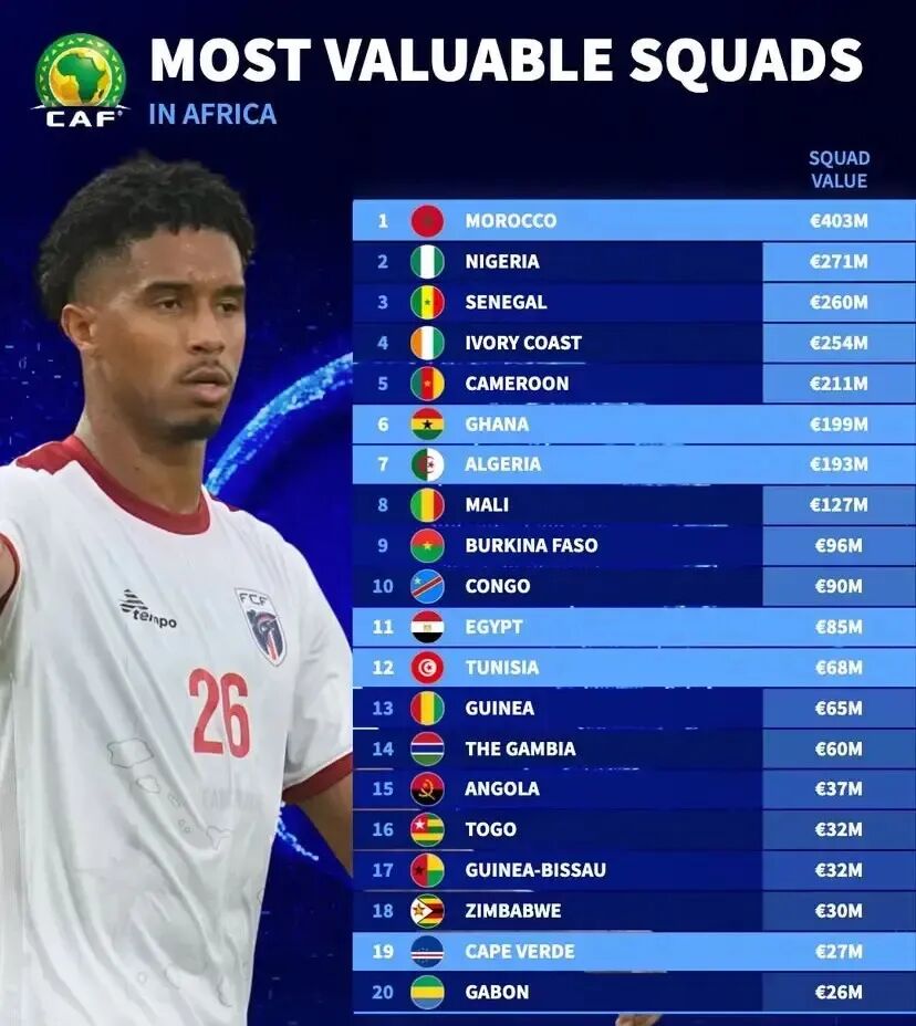 更难得的是,佛得角全队身价仅2700万欧元,在非洲排名第19位,连摩洛哥(4.03亿欧元)的零头都不到。