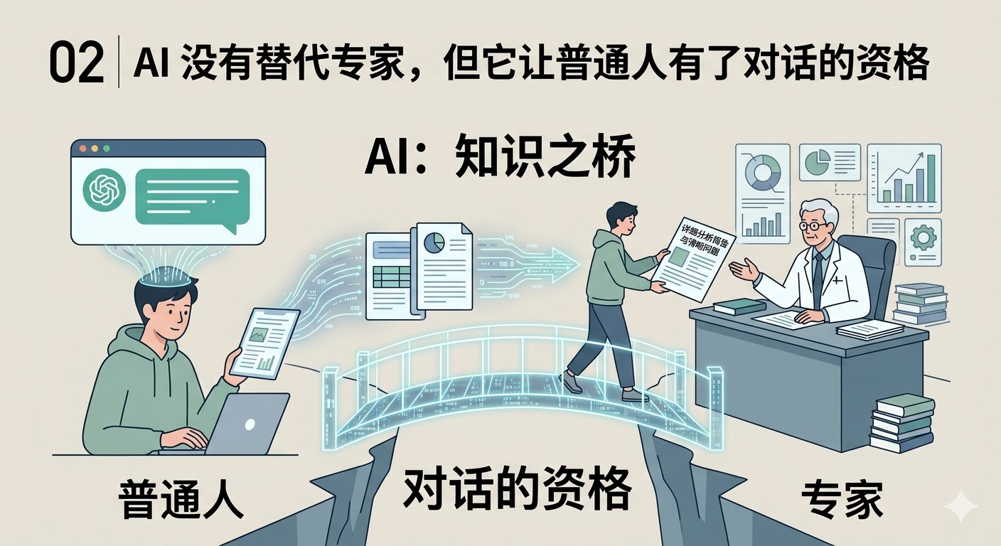 ## 02 AI 没有替代专家,但它让普通人有了对话的资格