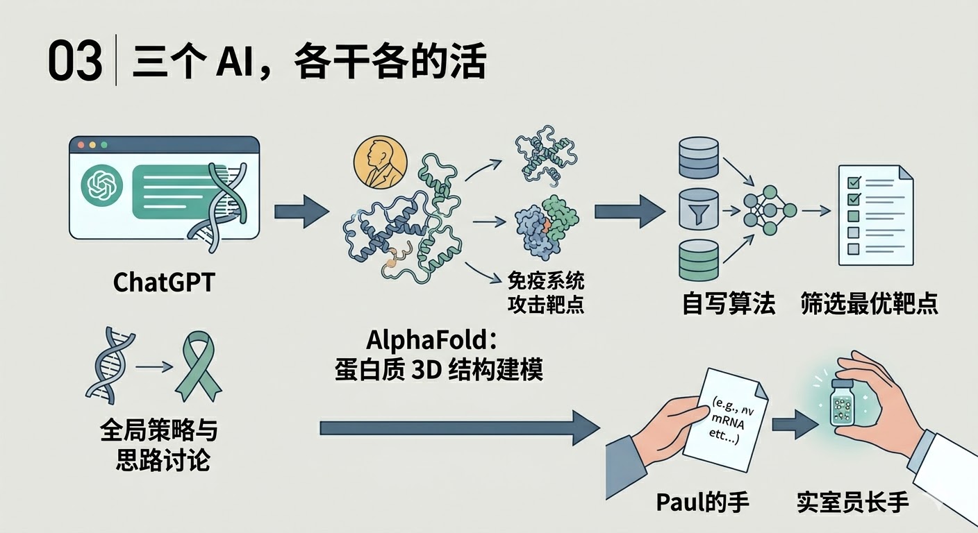 **ChatGPT 负责全局:** 从一开始的治疗策略规划,到分析基因数据时的思路讨论,再到疫苗设计方案的反复迭代。它不是直接给出答案的"医生",更像一个随时在线的研究搭档。