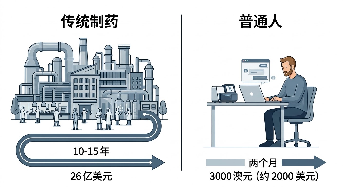 ## 01 传统制药:26 亿美元 vs 普通人:3000 美元