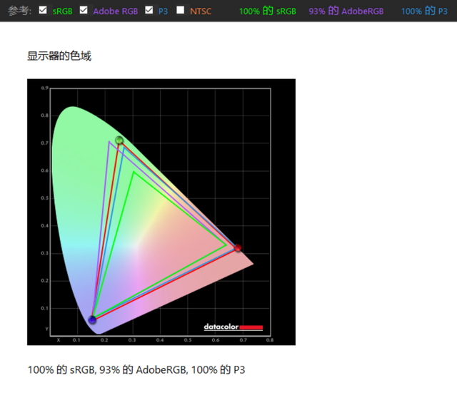 这里依然使用 Datacolor 的红蜘蛛 Elite 版本进行屏幕测试,色域覆盖部分两块屏幕都没有做色域缩放,系统默认设定下都覆盖了100%的 DCI-P3 色域,运行复古的游戏平台可能会相对偏艳丽(饱和度高)一些。