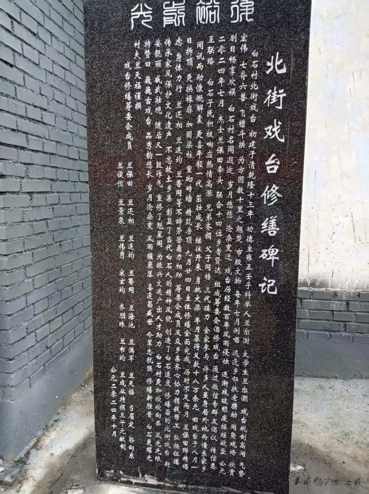 是日早晨,天朗气清,惠风和畅。修缮一新的北街戏台,迎着朝阳,雄姿展现。七脊六兽,飞檐斗拱。戏台一侧,功德碑记叙了古戏台的前世今生。戏台对面,历经数百年沧桑岁月的古槐树高大挺拔,与戏台相互呼应。