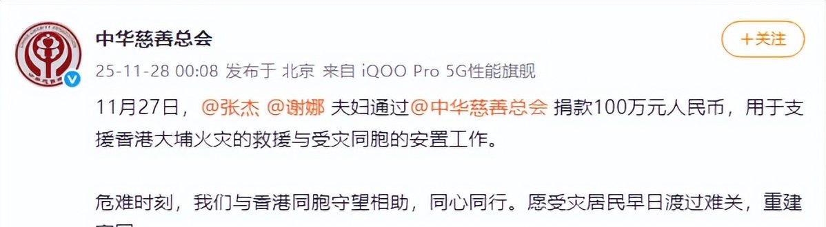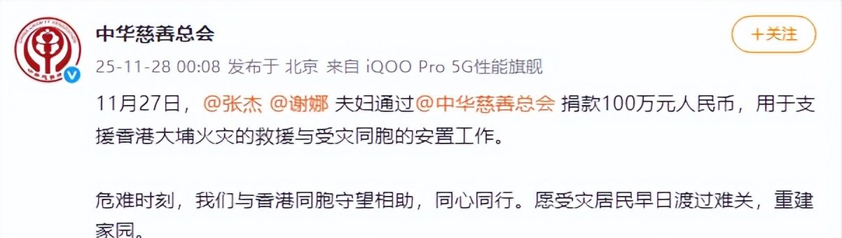 再说说张杰和谢娜这对夫妻。火灾后,他们捐了100万人民币专门用于受灾民众的临时安置。说实话,看到他们捐款时我第一反应是"他们不是还有三个女儿要养吗?"但人家二话不说就捐了这么多,这格局,我服!