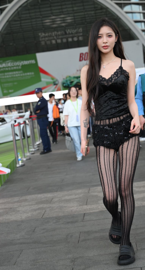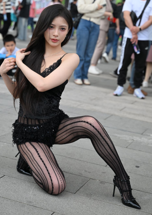 黑色蕾丝吊带裙缀满星光,渔网袜划破常规的性感密码。从“Shenzhen World”的霓虹招牌到灰色石砖路,她每一步都踩在时尚点——回眸时发丝扬起欲望,跪地时高跟鞋叩响都市心跳。